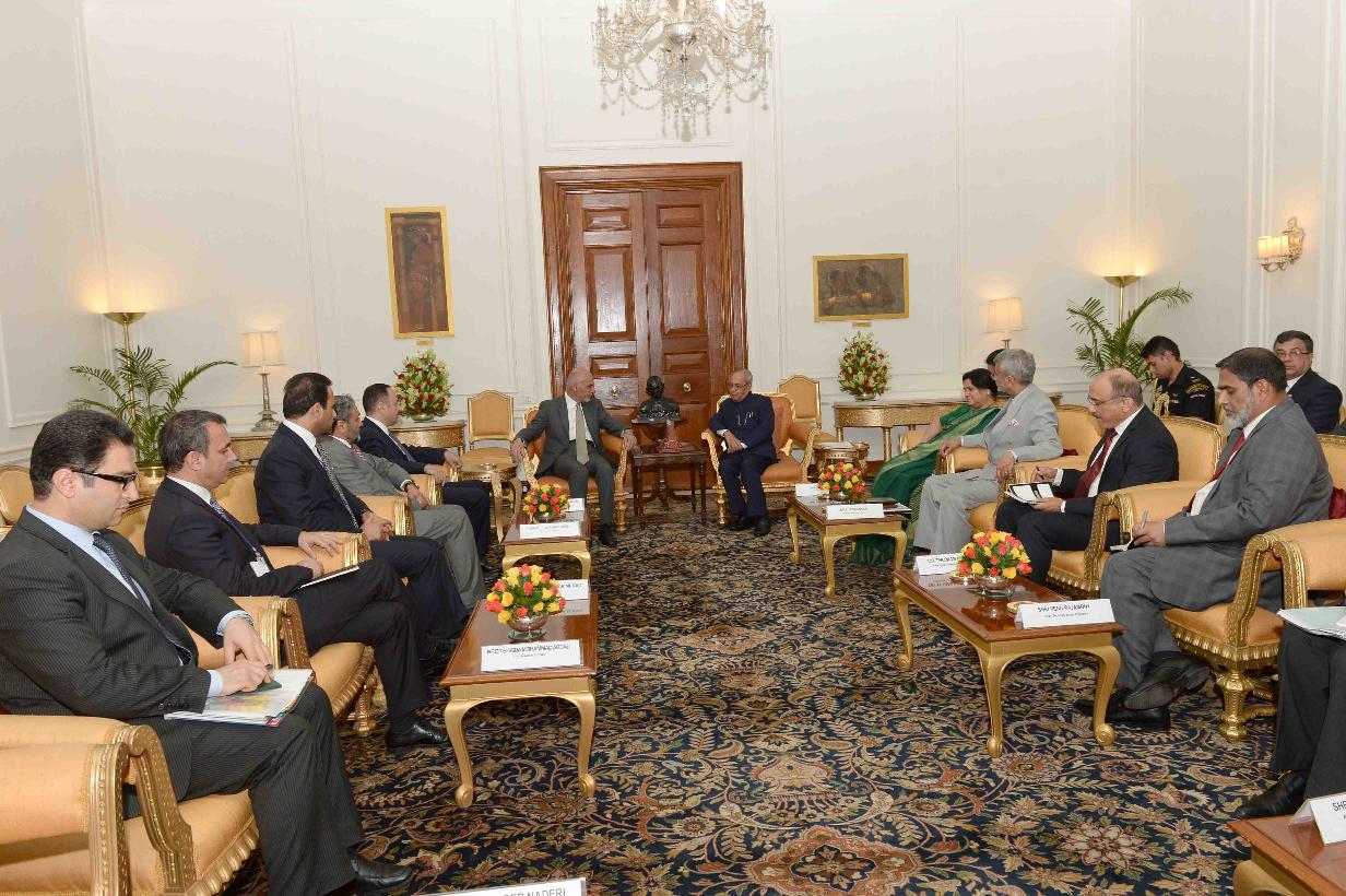 The Prime Minister and Minister of Interior, State of Qatar, H.E. Sheikh Abdullah bin Nasser bin Khalifa Al Thani calling on the President of India, Shri Pranab Mukherjee, at Rashtrapati Bhavan on on December 03, 2016.