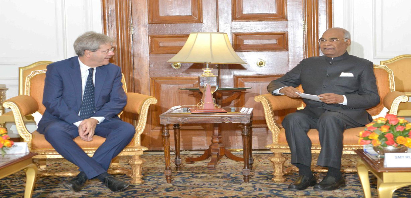 The Prime Minister of the Republic of Italy, H.E. Mr. Paolo Gentiloni calling on the President of India, Shri Ram Nath Kovind, at Rashtrapati Bhavan on October 30, 2017.