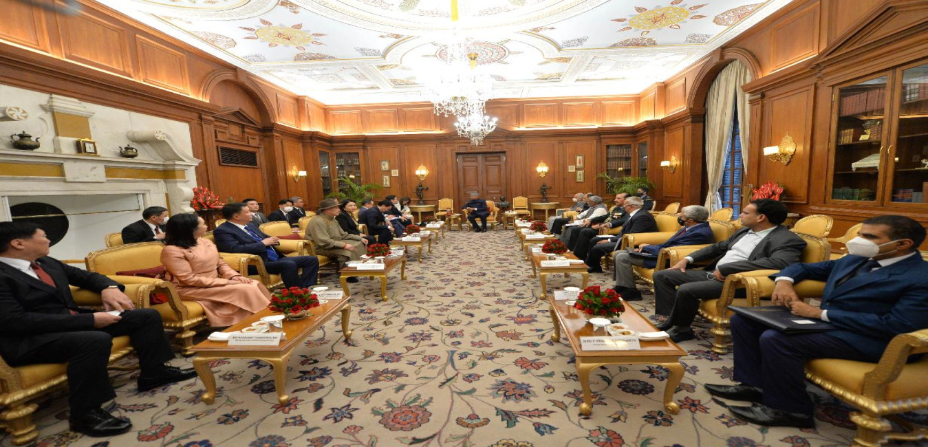 A Parliamentary delegation from Mongolia led by the Chairman of the State Great Hural of Mongolia, Mr. Gombojav Zandanshatar calling on the President of India, Shri Ram Nath Kovind, at Rashtrapati Bhavan on December 01, 2021.