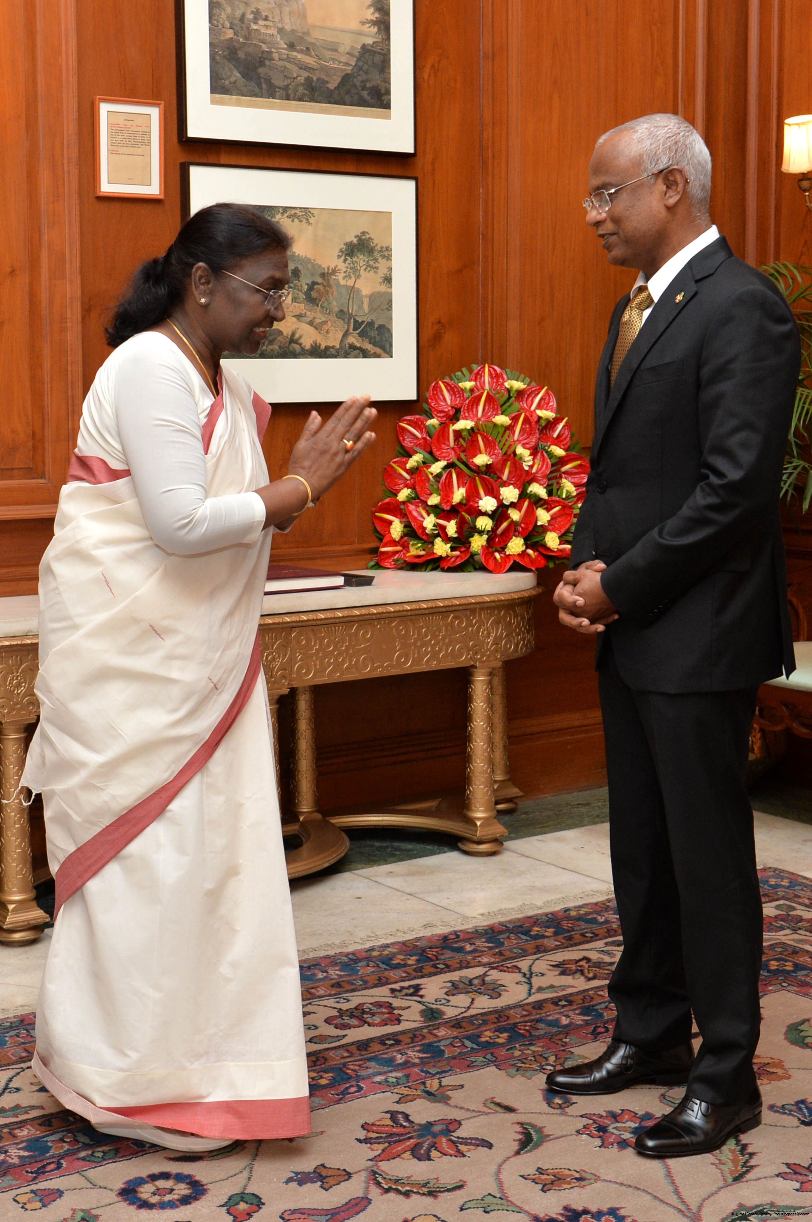 The President of the Republic of Maldives, H.E. Mr. Ibrahim Mohamed Solih calling on the President of India, Smt. Droupadi Murmu, at Rashtrapati Bhavan on August 02, 2022.