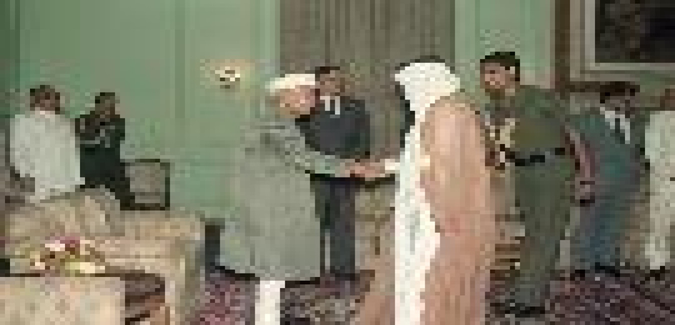 The Minister of Foreign Affairs of the State of Qatar, H.E. Sheikh Hamad Bin Jassim Bin Jaber Al-Thani calling on the President of India, Dr. Shankar Dayal Sharma at Rashtrapati Bhavan in New Delhi on April 03, 1995.