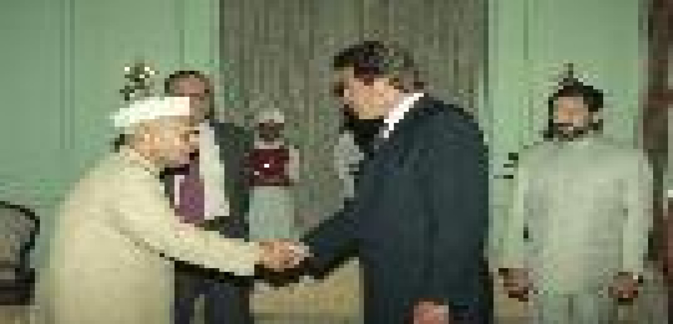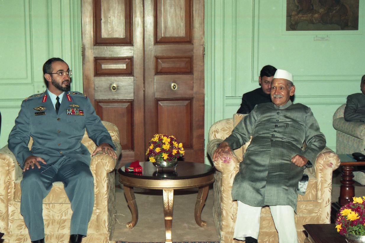 The Chief of Staff of UAE Defence Forces, H.E. Sheikh Mohammed Bin Zayed Al Nahyan calling on the President of India, Dr. Shankar Dayal Sharma, at Rashtrapati Bhavan in New Delhi on March 08, 1996.