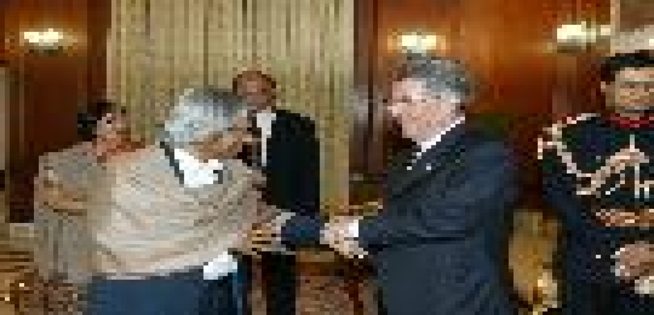 The King of Bhutan, His Majesty Jigme Singye Wangchuck calling on the President of India, Dr A P J Abdul Kalam at the North Drawing Room of Rashtrapati Bhavan in New Delhi on Jan 25, 2005