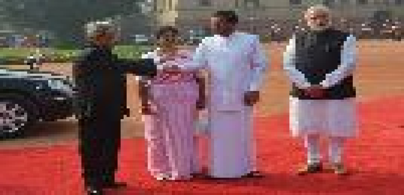 The President of India, Shri Pranab Mukherjee, receiving the President of the Democratic Socialist Republic of Sri Lanka, HE Mr Maithripala Sirisena, during his Ceremonial Reception, at Rashtrapati Bhavan, in New Delhi on Feb 16, 2015. Mrs Jayanthi Sirisena is also seen.