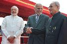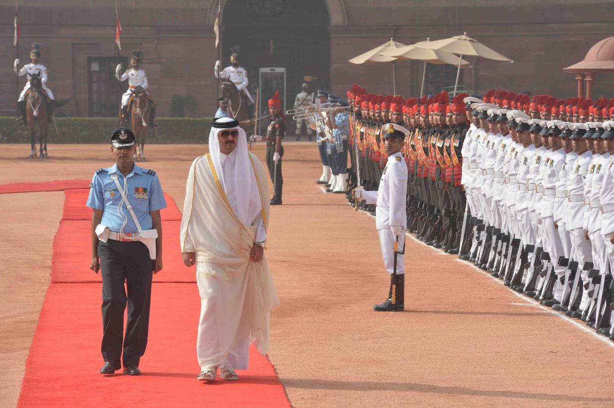 The President of India, Shri Pranab Mukherjee during the Ceremonial Reception of the Emir of the State of Qatar, His Highness Sheikh Tamim Bin Hamad Al-Thani, at Rashtrapati Bhavan, in New Delhi on March 25, 2015.