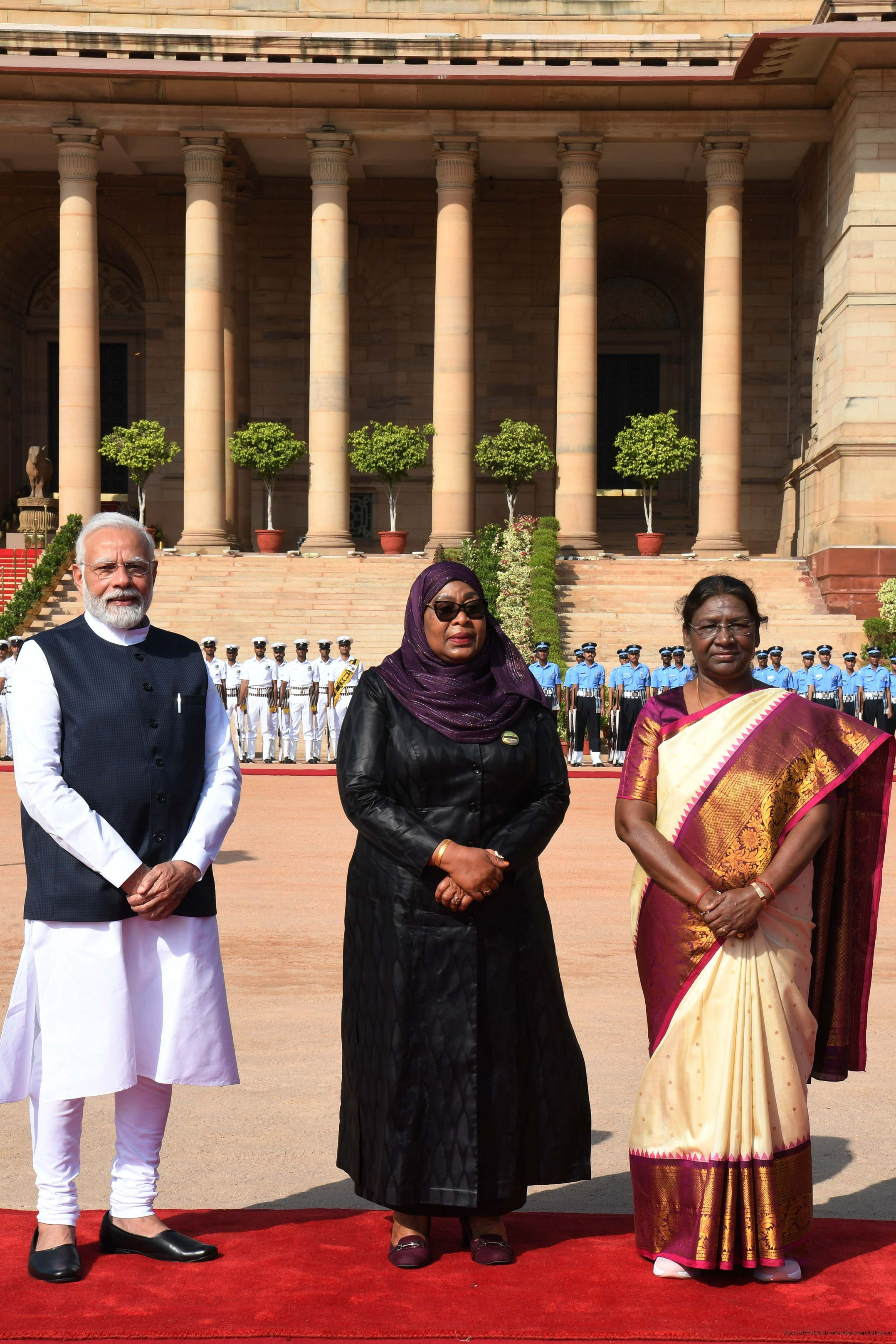 The President of India, Smt Droupadi Murmu accords a ceremonial welcome to H.E. Dr Samia Suluhu Hassan, the President of the United Republic of Tanzania at Rashtrapati Bhavan on October 09, 2023.