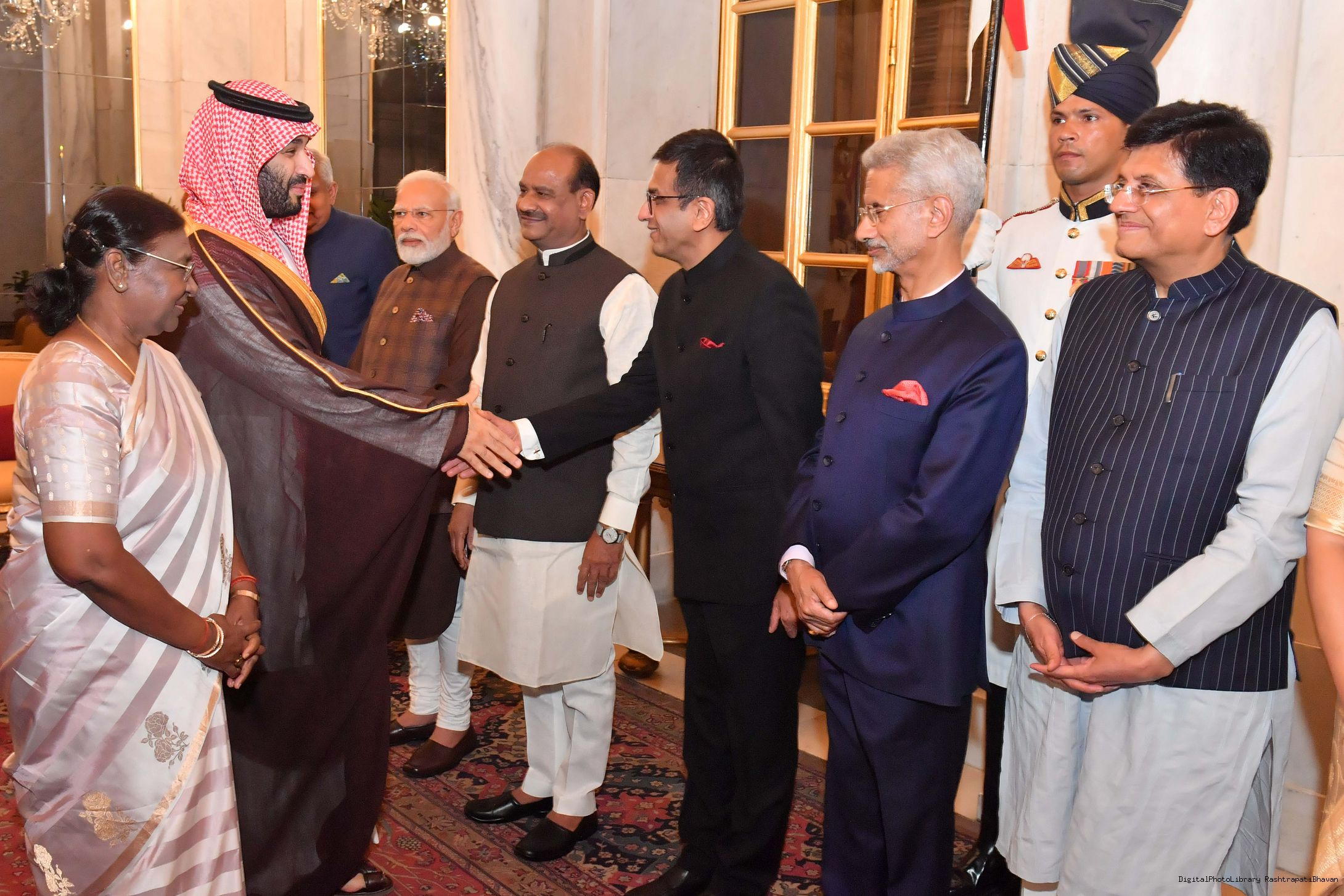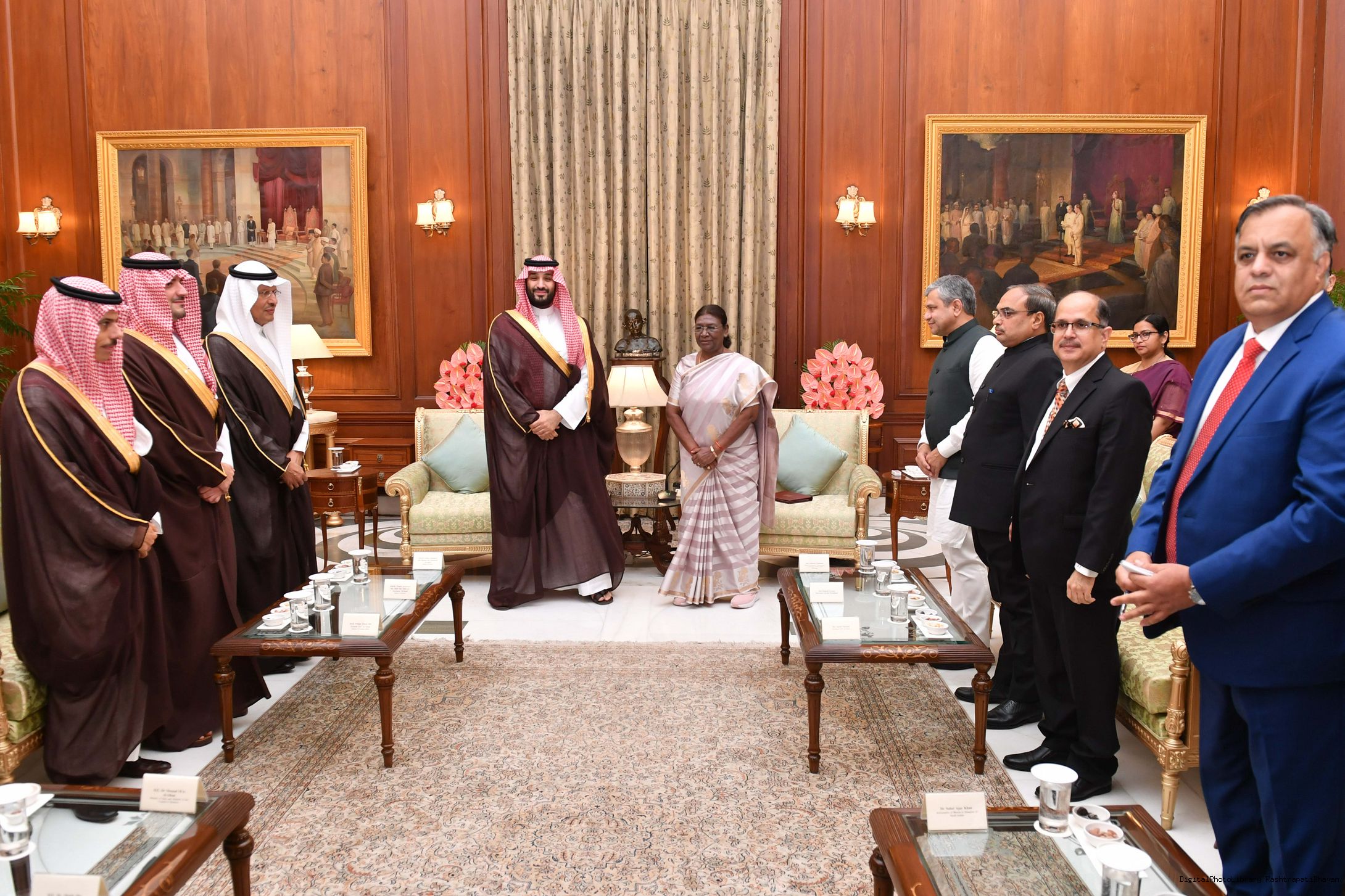 The President of India, Smt Droupadi Murmu received His Royal Highness Prince Mohammed bin Salman bin Abdulaziz Al Saud, the Crown Prince and Prime Minister of the Kingdom of Saudi Arabia at Rashtrapati Bhavan in New Delhi on September 11, 2023.