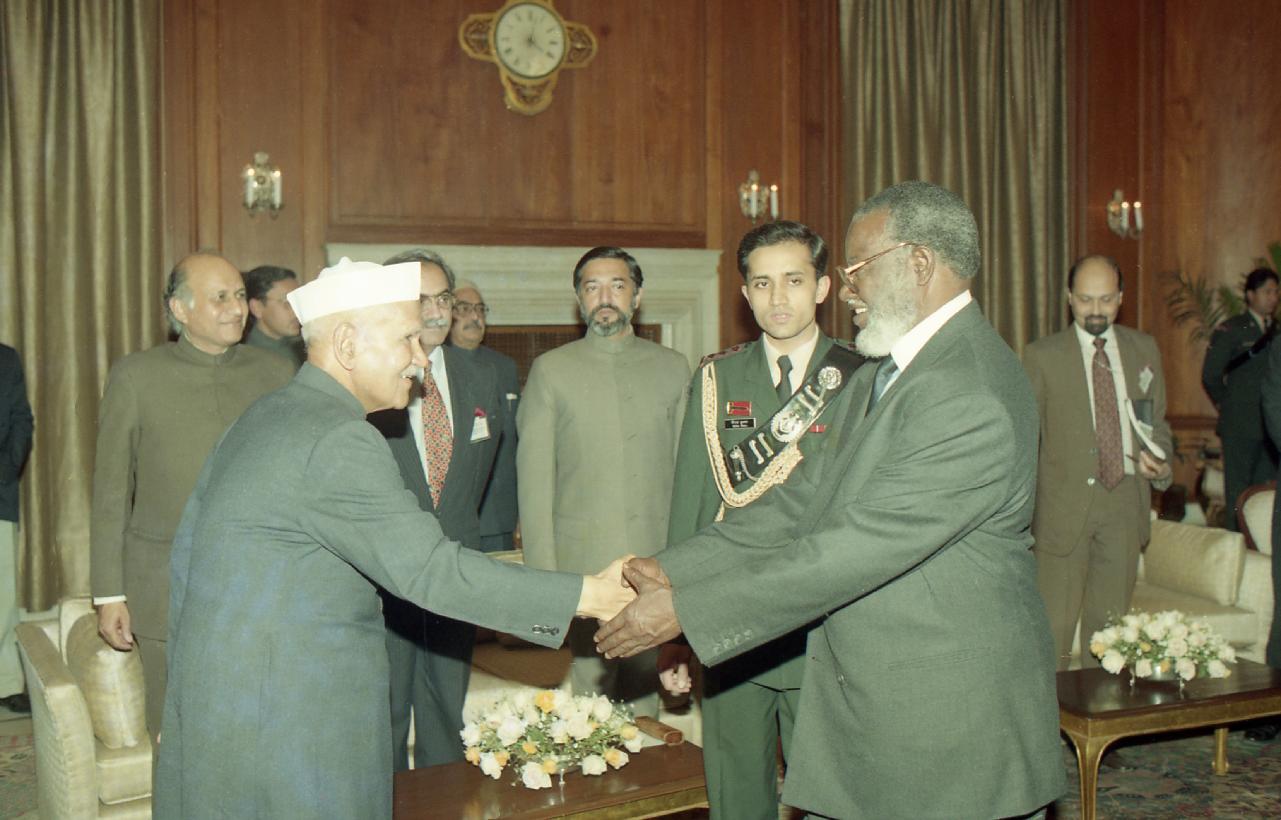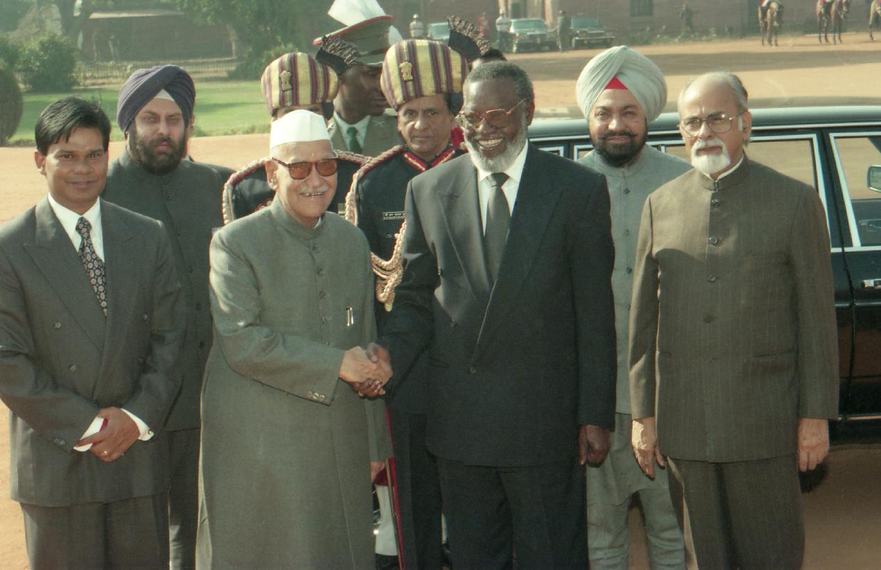 The President of India, Dr. Shankar Dayal Sharma receiving the President of the Republic of Namibia, HE Dr. Sam Nujoma at the Ceremonial Reception, at Rashtrapati Bhavan in New Delhi on February 14, 1997.
