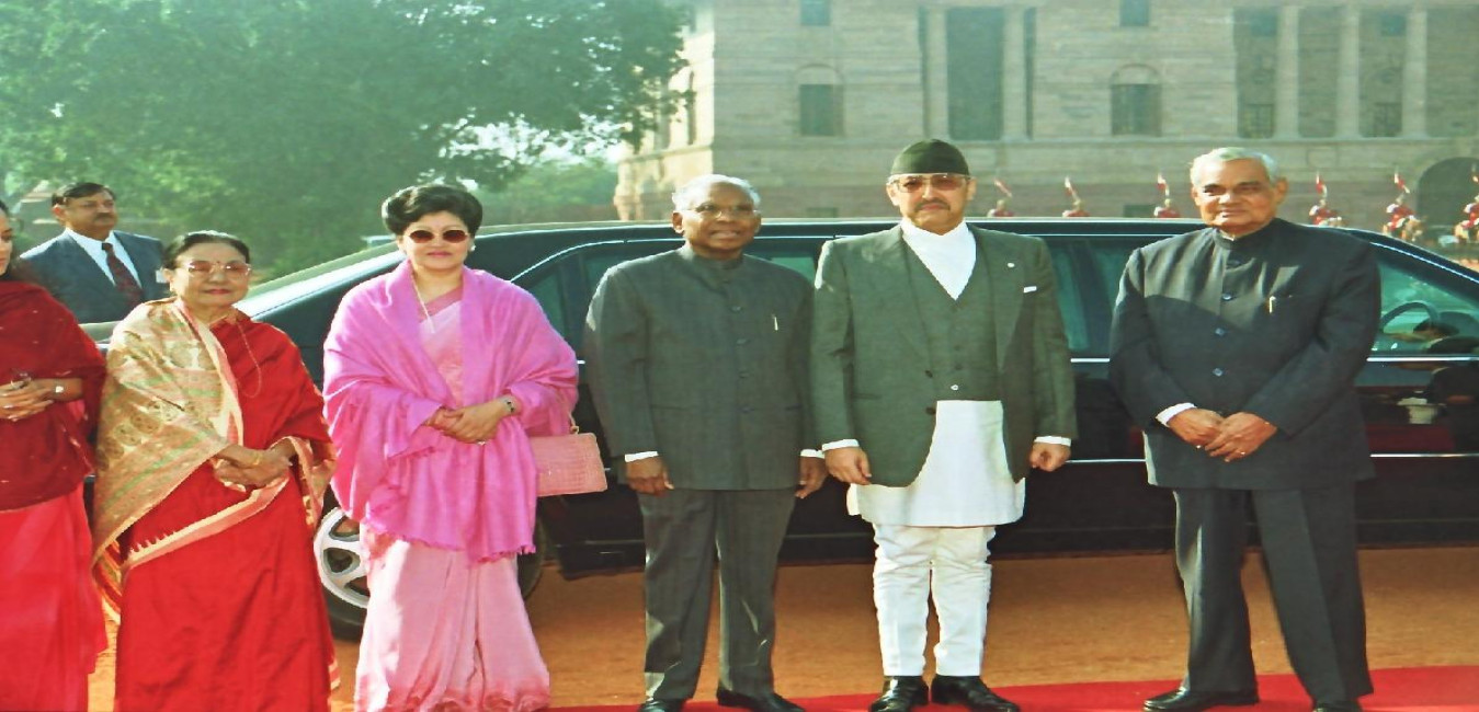 Their Majesties King of Nepal, His Majesty Birendra Bir Bikram Shah Dev and Queen Aishwarya Rajya Laxmi Devi Shah calling on the President of India, Shri K R Narayanan at the North Drawing Room of Rashtrapati Bhavan in New Delhi on Jan 25, 1999