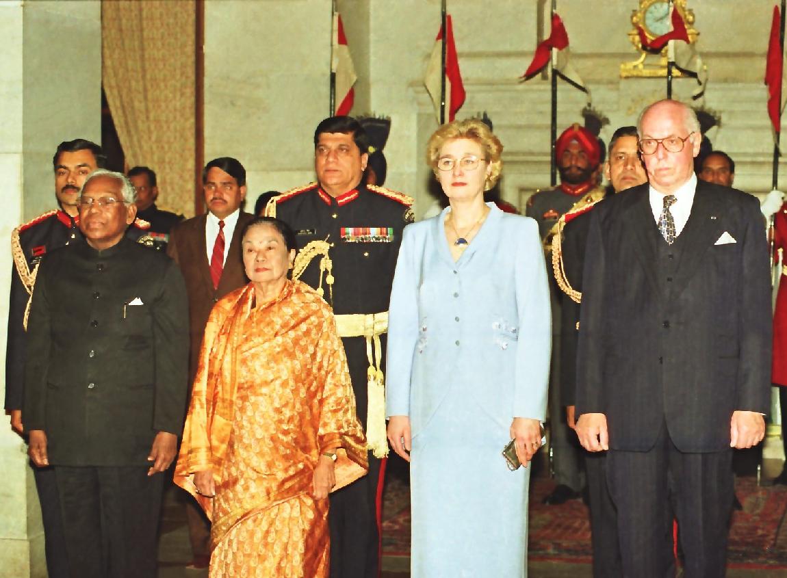 The President of the Swiss Confederation, HE Mr Flavio Cotti and his wife Mrs Renata Cotti calling on the President of India, Shri K R Narayanan at the North Drawing Room of Rashtrapati Bhavan in New Delhi on Nov 24, 1998