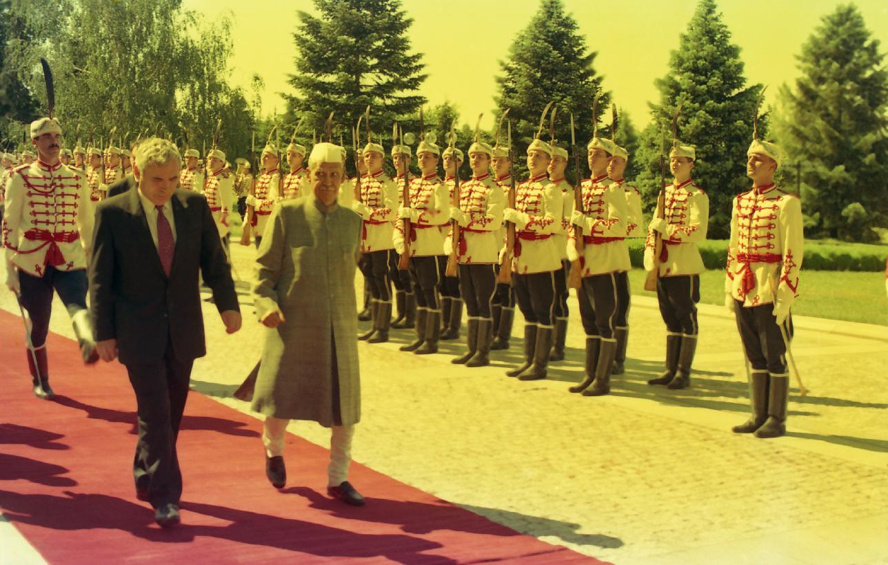 The President of India, Dr. Shankar Dayal Sharma with the President of Bulgaria, Mr. Zhelyu Zhelev, during Departure Ceremony, at Sofia, in Bulgaria on May 28, 1994.