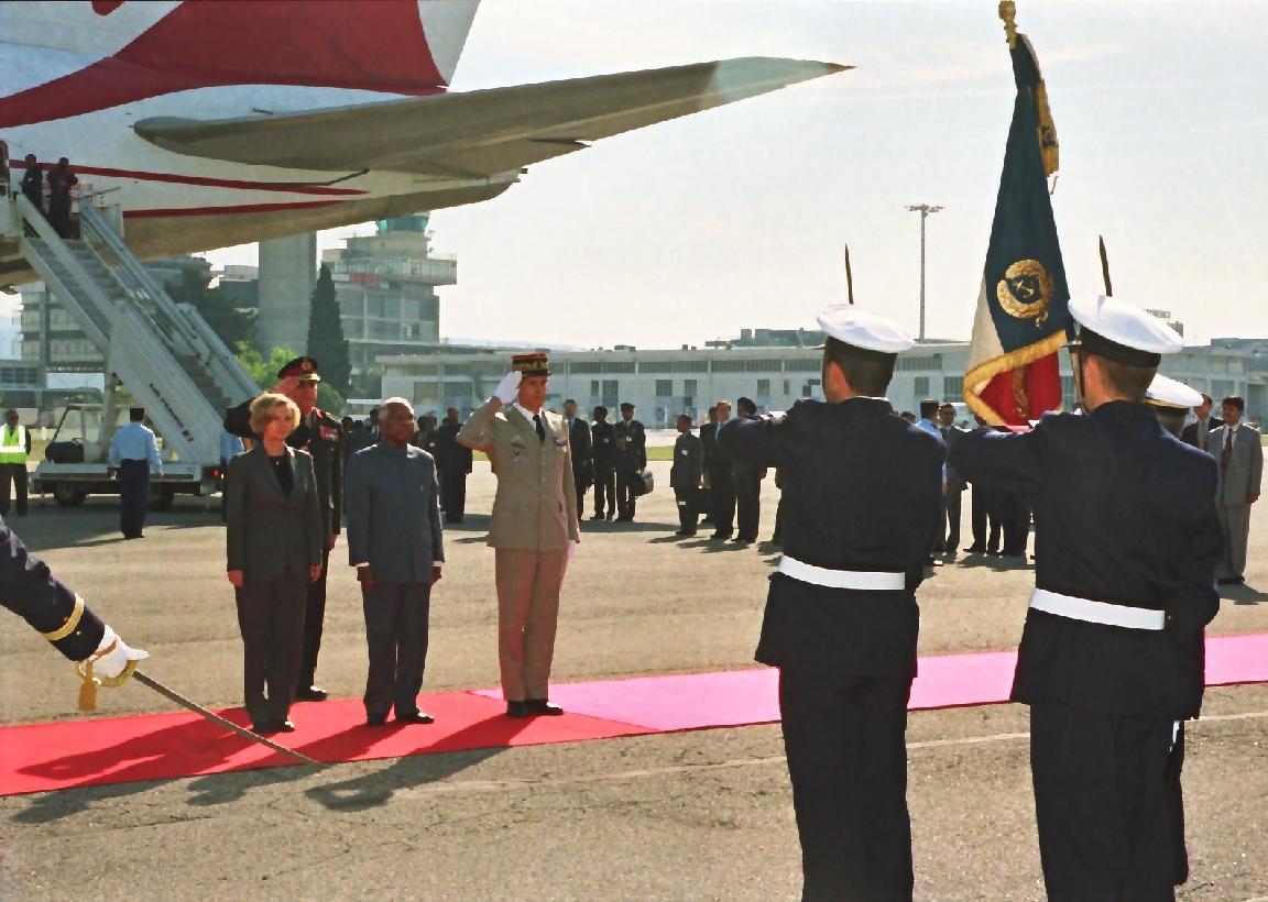 The President of India, Shri K R Narayanan being Greeted by the Minister of Justice of France, HE Mr Mme Elisabeth Guigou during his Ceremonial departure from Marseille Airport in France on April 21, 2000