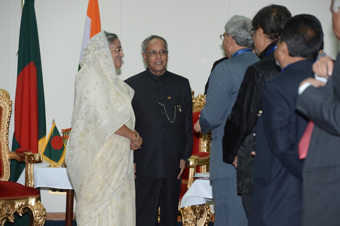 The President of India, Shri Pranab Mukherjee talking to Prime Minister of Bangladesh on 3 March 2013