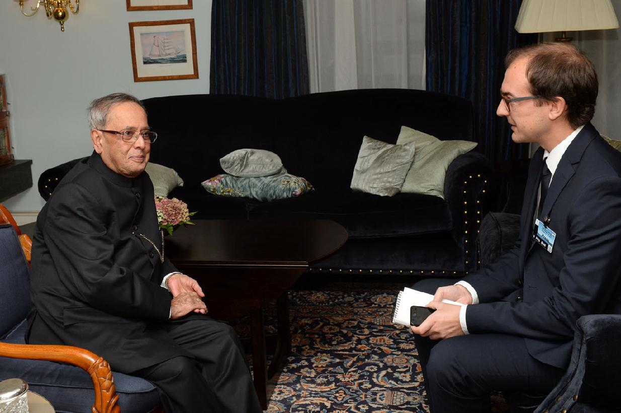 The President of India, Shri Pranab Mukherjee being interviewed by the Norwegian Journalist i VGs Utenriksgrouppe, Mr Stian Eisentrager at Oslo in Norway on Oct 12, 2014