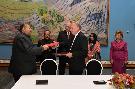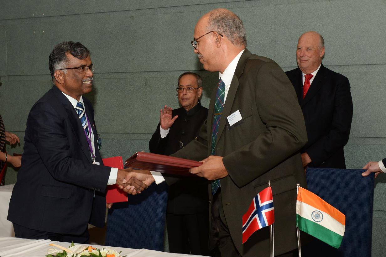 The President of India, Shri Pranab Mukherjee with the King of Norway, Mr Harald V witnessing the signing of the Memorandum of Understanding between India and Norway at Oslo in Norway on Oct 14, 2014