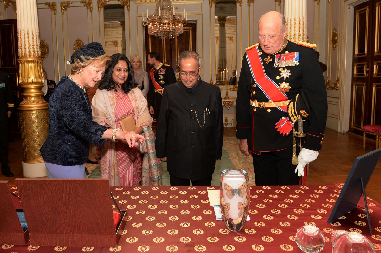 The President of India, Shri Pranab Mukherjee during Exchange of Gifts at Fuglevaerelset (Bird Room) at Oslo in Norway on Oct 13, 2014