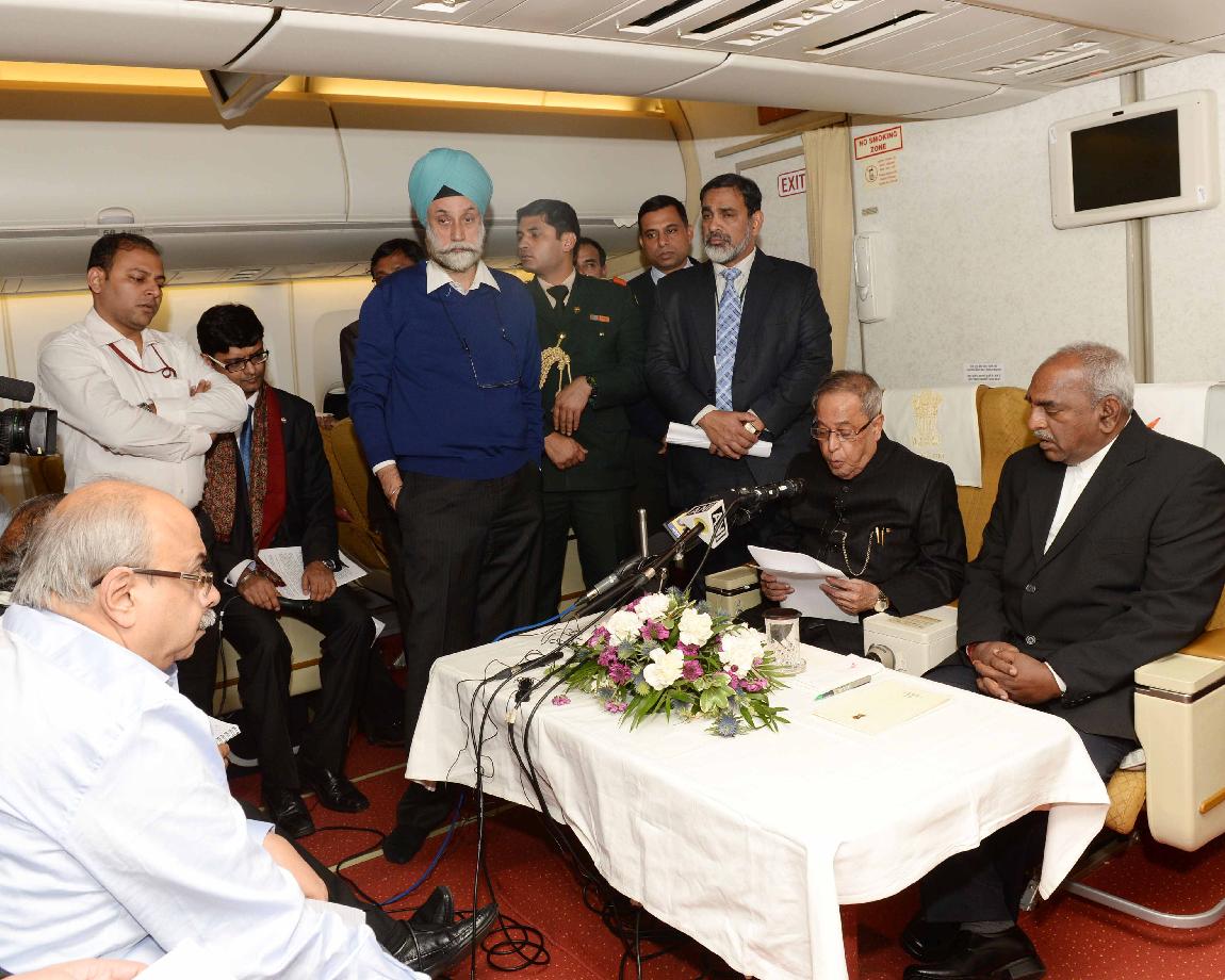 The President of India, Shri Pranab Mukherjee interacting with his Accompanying Media Personnel on Board on his way Back to India from Finland on Oct 17, 2014