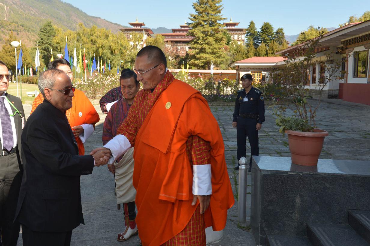 The President of India, Shri Pranab Mukherjee being welcomed by the King of Bhutan, HE Jigme Khesar Namgyel Wangchuck during his Ceremonial Arrival for the State Visit to Bhutan at Paro in Bhutan on Nov 07, 2014