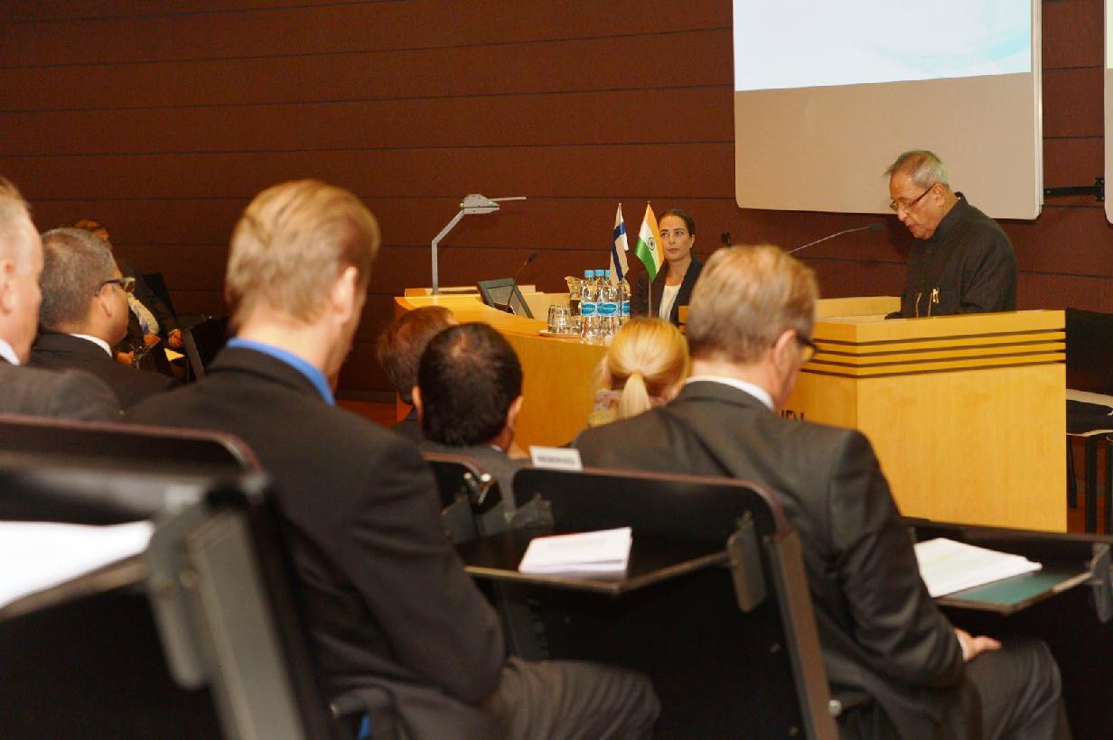 The President of India, Shri Pranab Mukherjee addressing at the Parliament of Finland, HE Mr Eero Heinaluoma, Speaker of Parliament of Finland Escorted him for going around Central Hall of Parliament and also attended a Delegation Level Talks at Helsinki in Finland on Oct 16, 2014