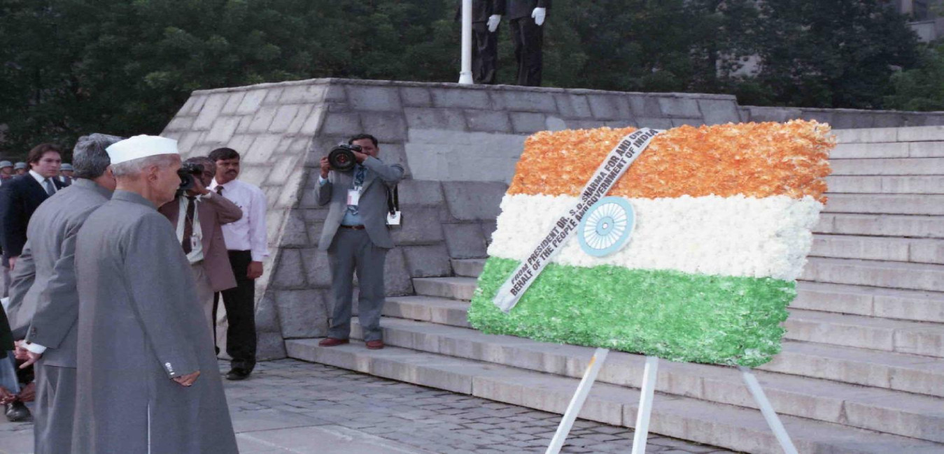 The President of India, Dr. Shankar Dayal Sharma paid floral tributes at the Statues of Mahatma Gandhi, Pt Jawaharlal Nehru and Rabindra Nath Tagore, at Santiago, in Chile on June 02, 1995.