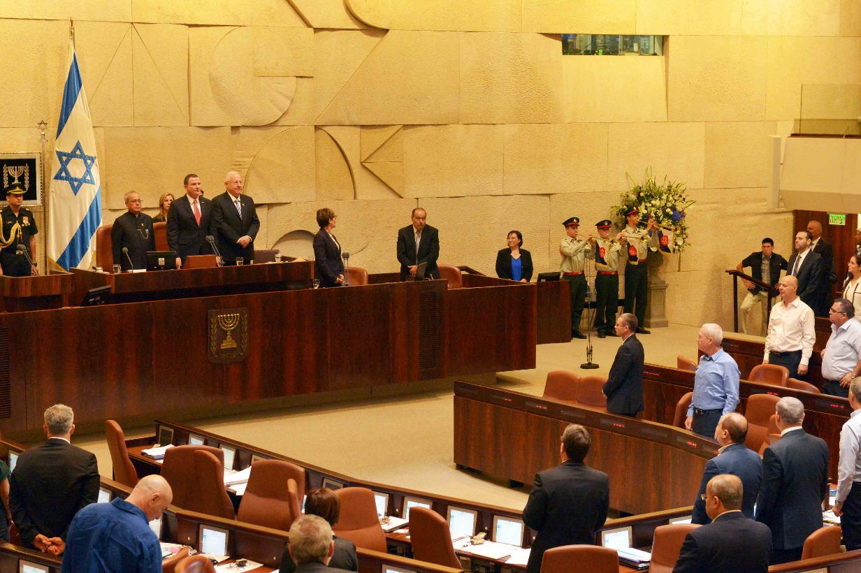 The President of India, Shri Pranab Mukherjee addressing the Members of Knesset (Israeli Parliament), at Jerusalem, during his State visit of Israel on October 14, 2015. The President of Israel, Mr. Reuven Rivlin, the Prime Minister of Israel, Mr. Benjamin Netanyahu and the Speaker of Knesset, Mr. Yuli-Yoel Edelstein are also seen.