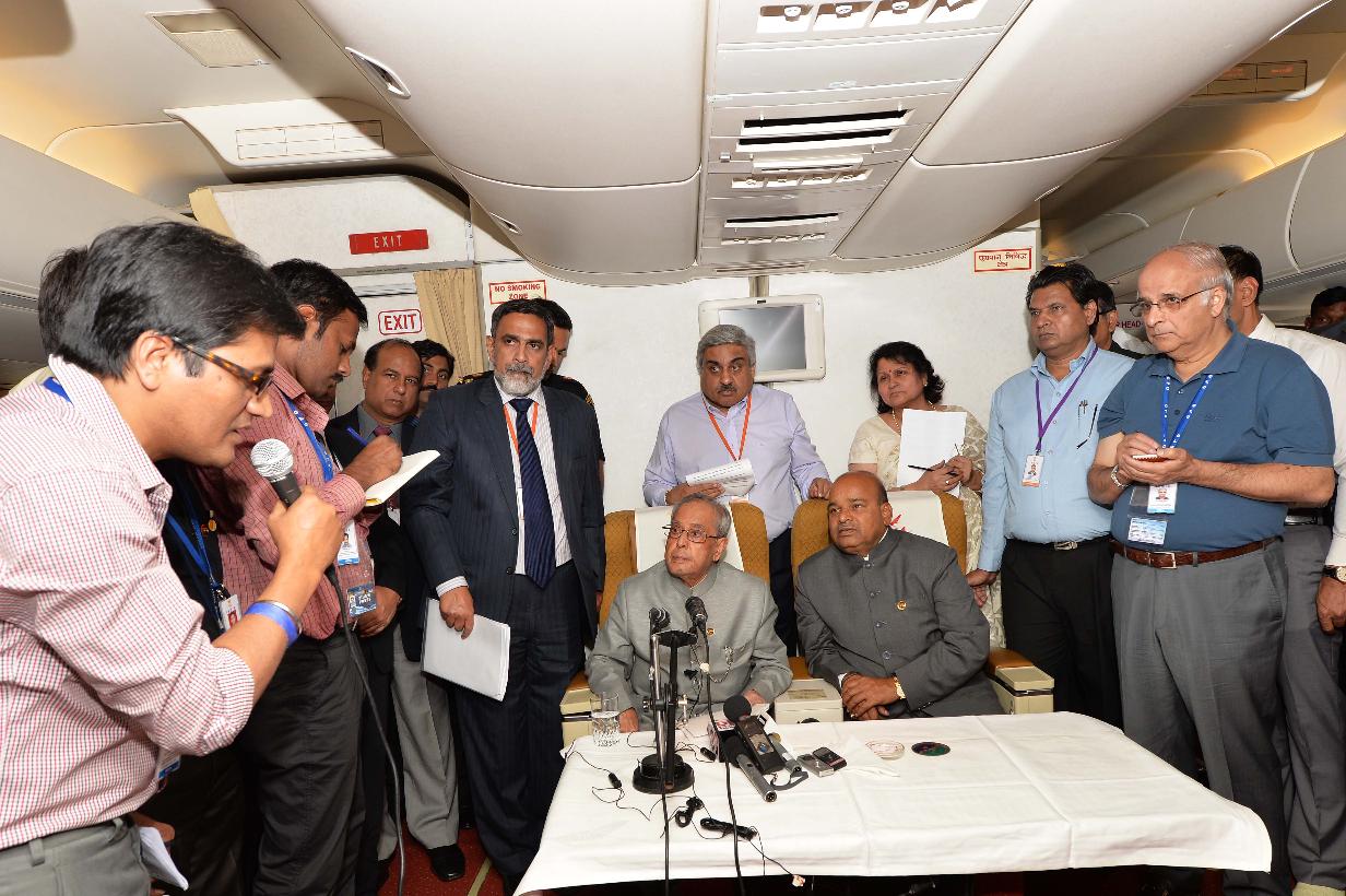 The President of India, Shri Pranab Mukherjee interacting with the accompanying officials and media delegation on board, Air India Special aircraft on his way to Papua New Guinea on April 27, 2016.
