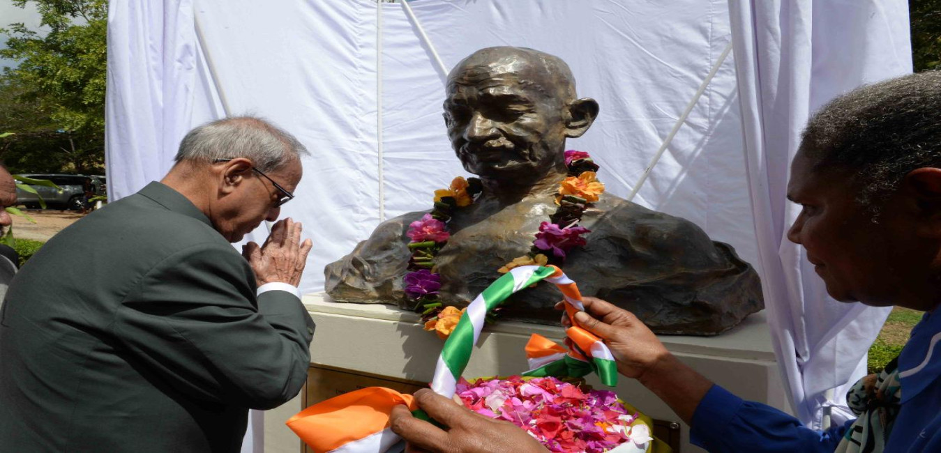 The President of India, Shri Pranab Mukherjee paying floral tributes at the statue of Mahatma Gandhi during his visit to University of Papa New Guinea (UPNG) at Port Moresby, in Papua New Guinea on April 29, 2016.