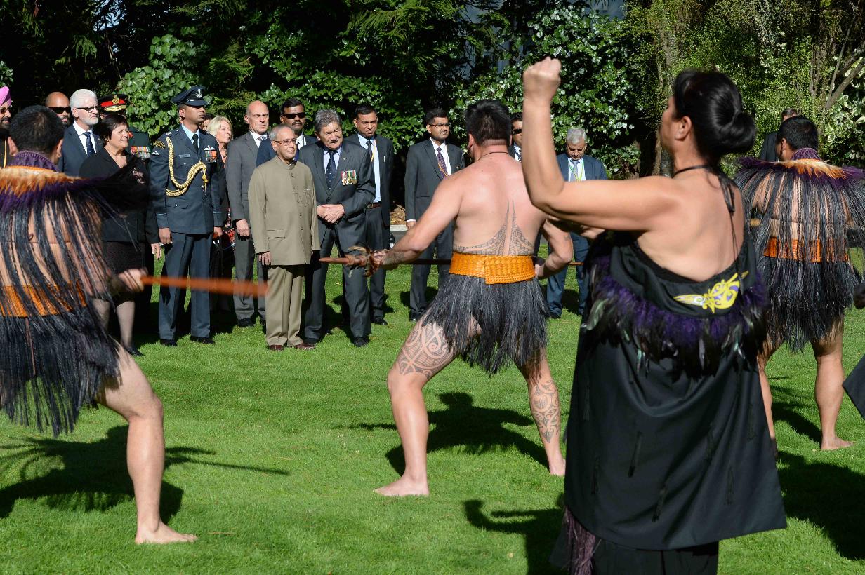 The President of India, Shri Pranab Mukherjee being traditionally Maori Style welcomed by Mr. Gregory Baughen, Official Secretary of the Governor General of New Zealand, at Government House, in New Zealand on April 30, 2016.