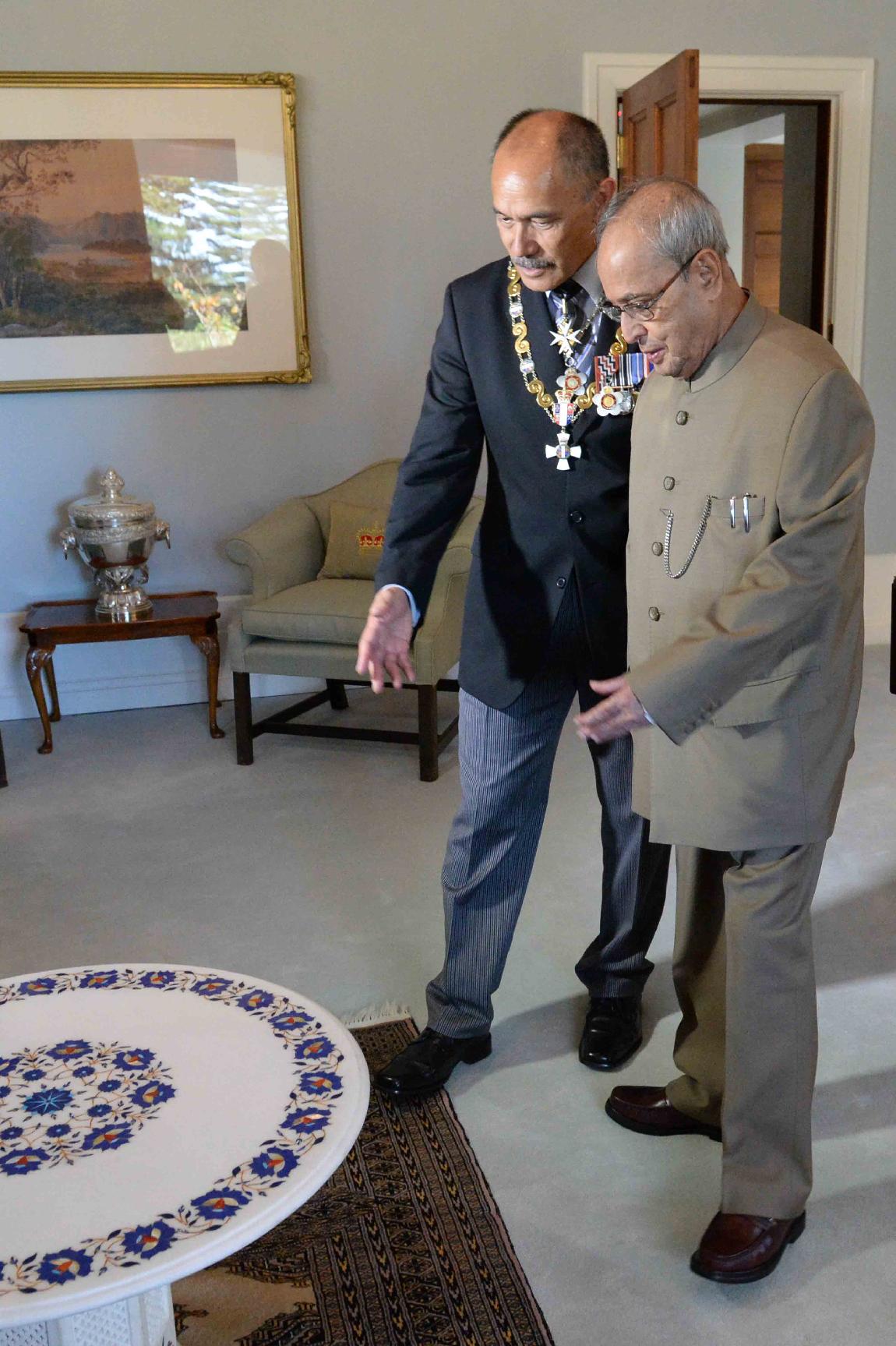 The President of India, Shri Pranab Mukherjee exchanging the gifts with the Governor General of New Zealand, H.E. Lieutenant General, The Rt. Hon ble Sir Jerry Mateparae, GNZM, QSO, at Government House, in New Zealand on April 30, 2016.