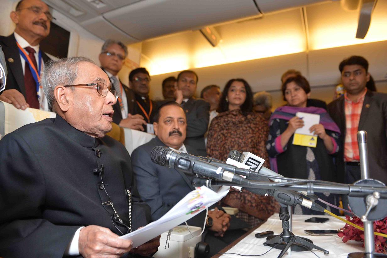 The President of India, Shri Pranab Mukherjee interacting with the media delegates onboard, on his way back to Delhi after his State visits to Ghana, Cote d Ivoire and Namibia on June 17, 2016.