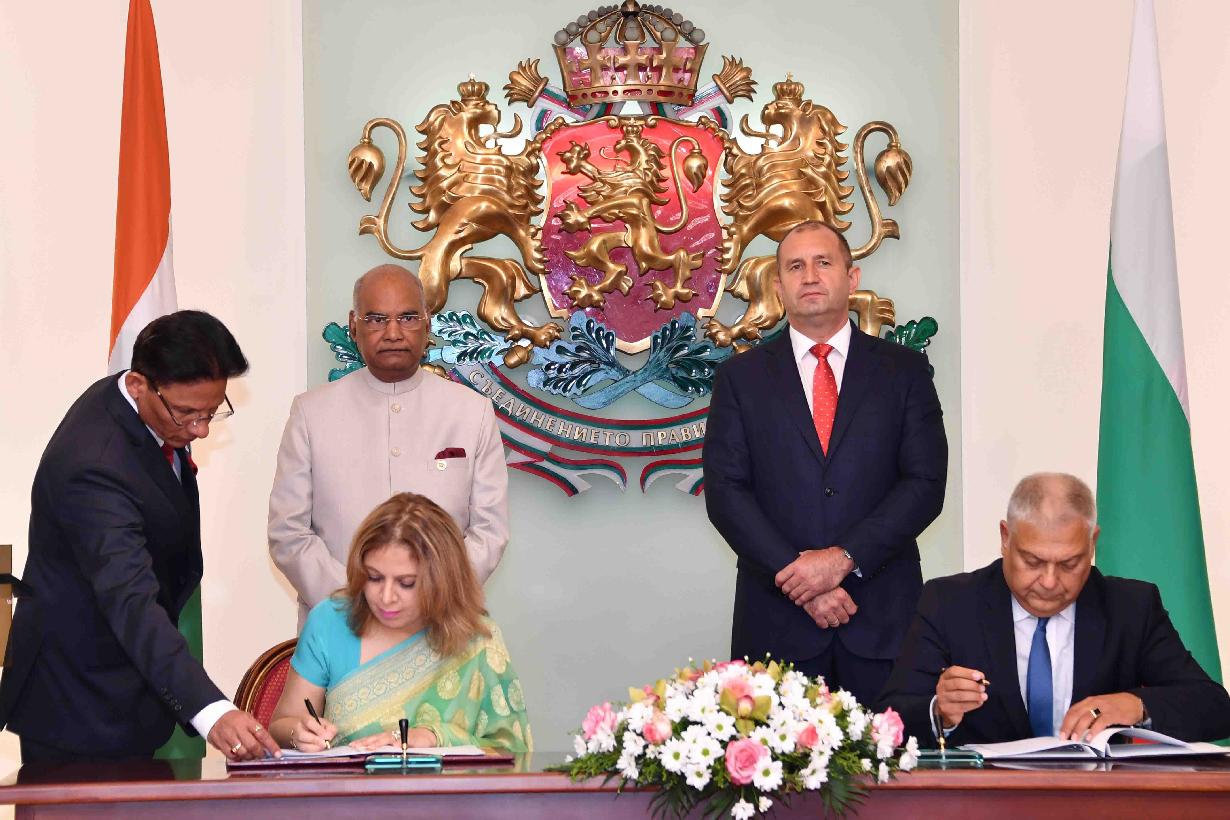 The President of India, Shri Ram Nath Kovind and the President of Bulgaria, H.E. Mr. Rumen Radev witnessing the signing of agreements between India and Bulgaria, at the Administration of the President Building, in Sofia, Bulgaria on September 05, 2018.