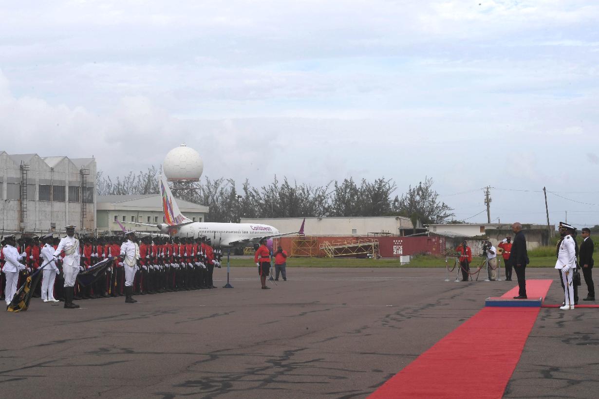 The President of India, Shri Ram Nath Kovind being received by the Governor General of Jamaica, H.E. Sir Patrick Allen and the Prime Minister of Jamaica, H.E. Andrew Holness, on his arrival, at Norman Manley International Airport, at Kingston, in Jamaica on May 15, 2022. The President was accorded a guard of honour at the airport.