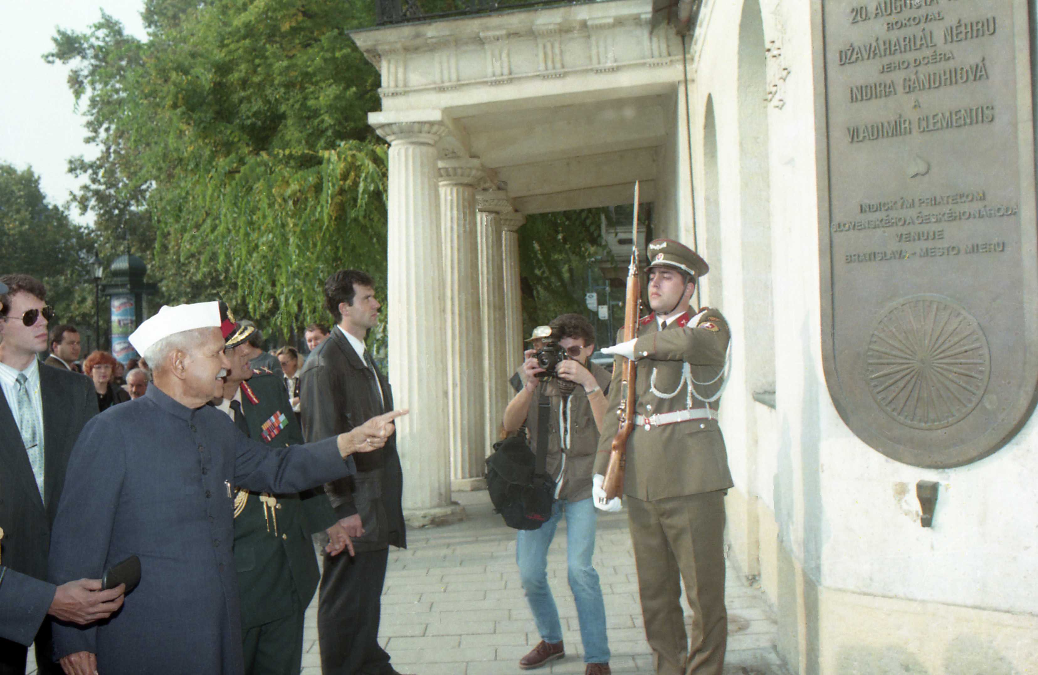 The President of India, Dr. Shankar Dayal Sharma seeing the Plaque Commemorating the visit of Jawaharlal Nehru in 1938, at Hviezdoslavo Square, in Bratislava, Slovakia on October 10, 1996.