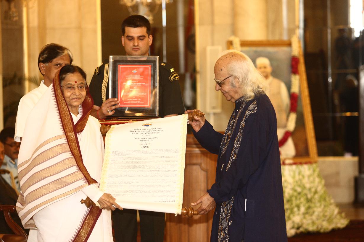 | Caption: | The President of India, Smt Pratibha Devisingh Patil presenting the Lal Bahadur Shastri National Award 2011 for Excellence in Public Administration, Academics and Management to Prof Yash Pal at Rashtrapati Bhavan in New Delhi on Oct 15, 2011 |