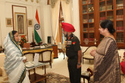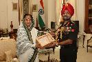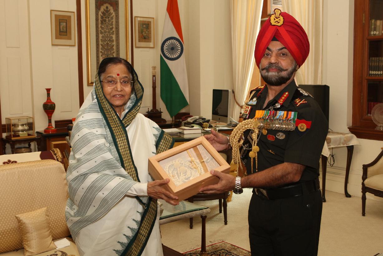 | Caption: | The President of India, Smt Pratibha Devisingh Patil interacting with Lt Gen Arvinder Singh Lamba and Smt Sabinder Lamba at Rashtrapati Bhavan in New Delhi on Oct 21, 2011 |