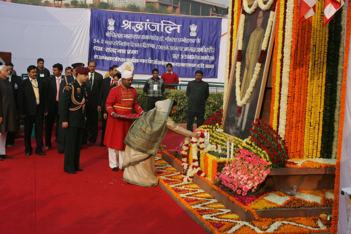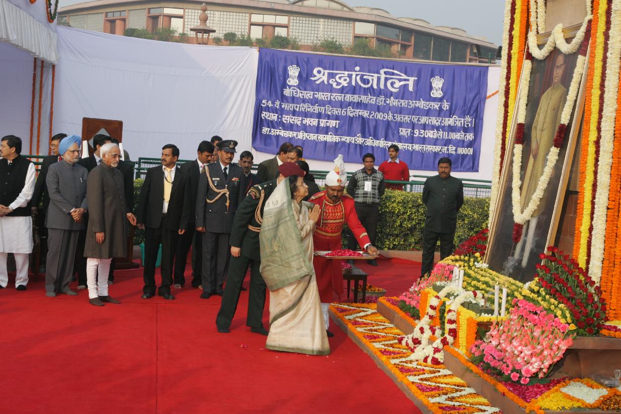 | Caption: | The President of India, Smt Pratibha Devisingh Patil paying homage to Dr B R Ambedkar on the occasion of his Mahaparinirvan Diwas at Parliament House in New Delhi on Dec 05, 2009 |