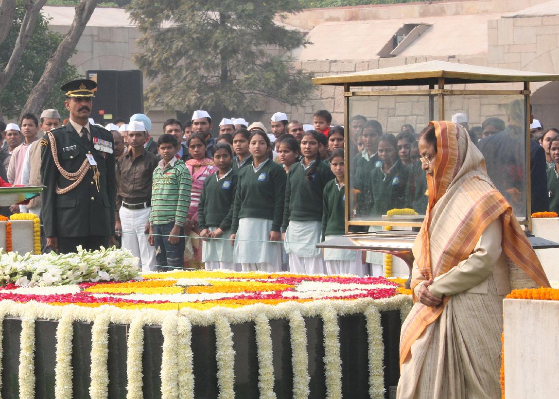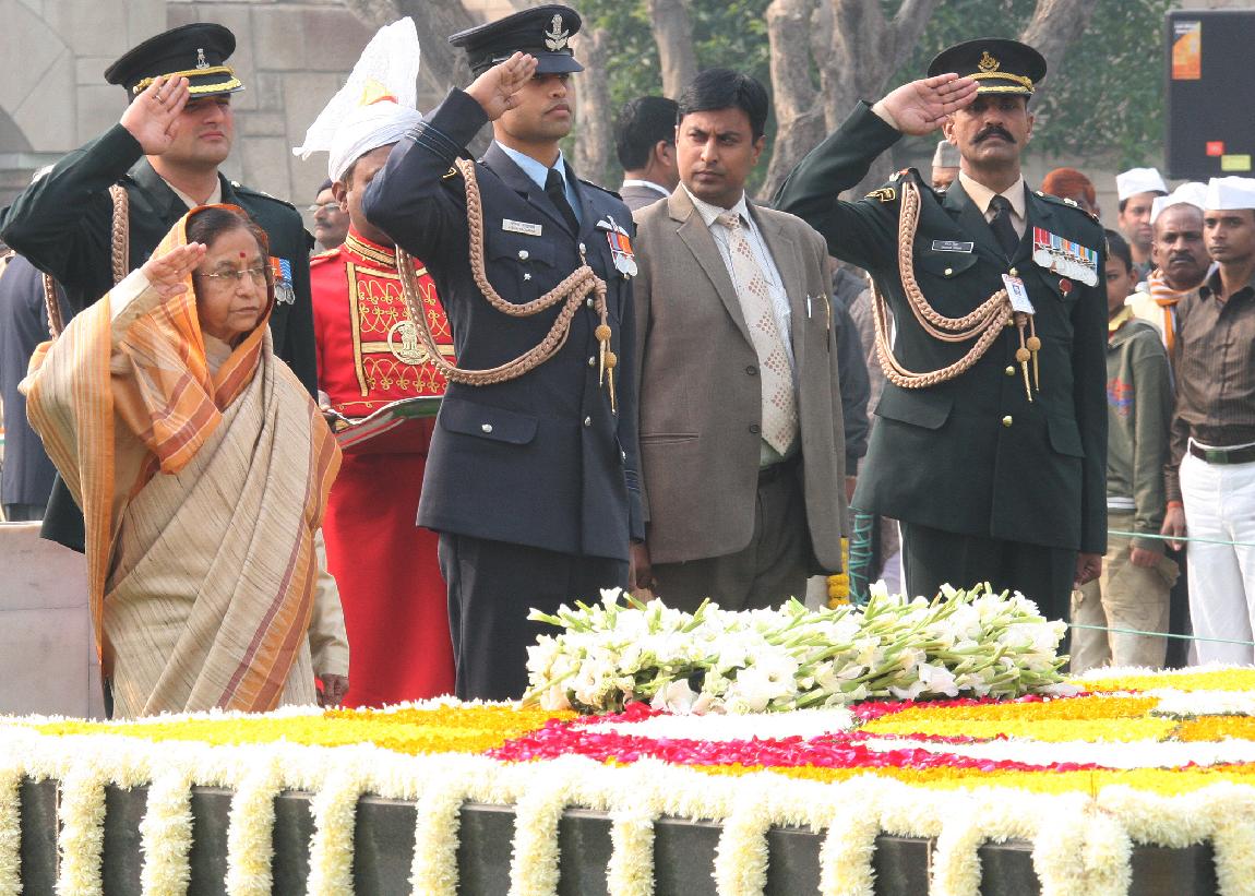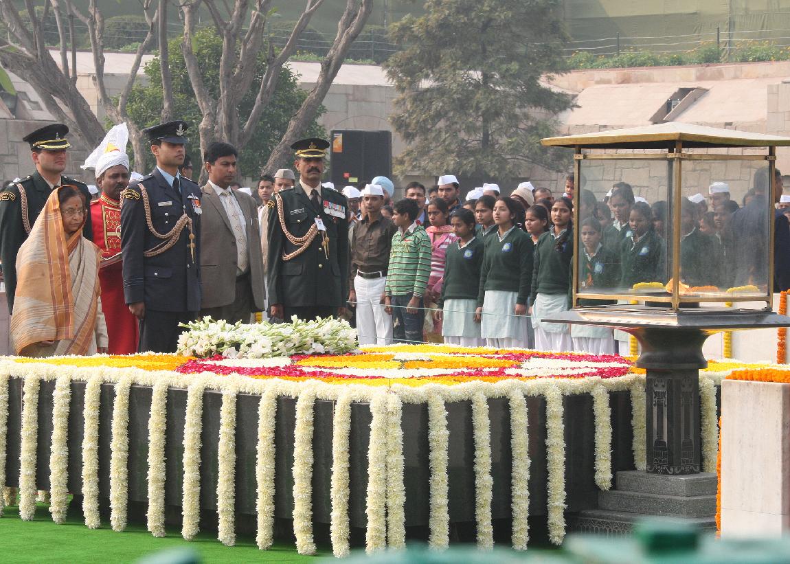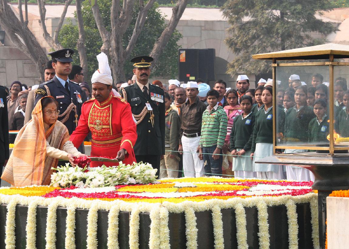 | Caption: | The President of India, Smt Pratibha Devisingh Patil paying Homage at the Samadhi of the Father of the Nation, Mahatma Gandhi on the occasion of his Death Anniversary at Raj Ghat in New Delhi on Jan 30, 2011 |
