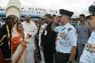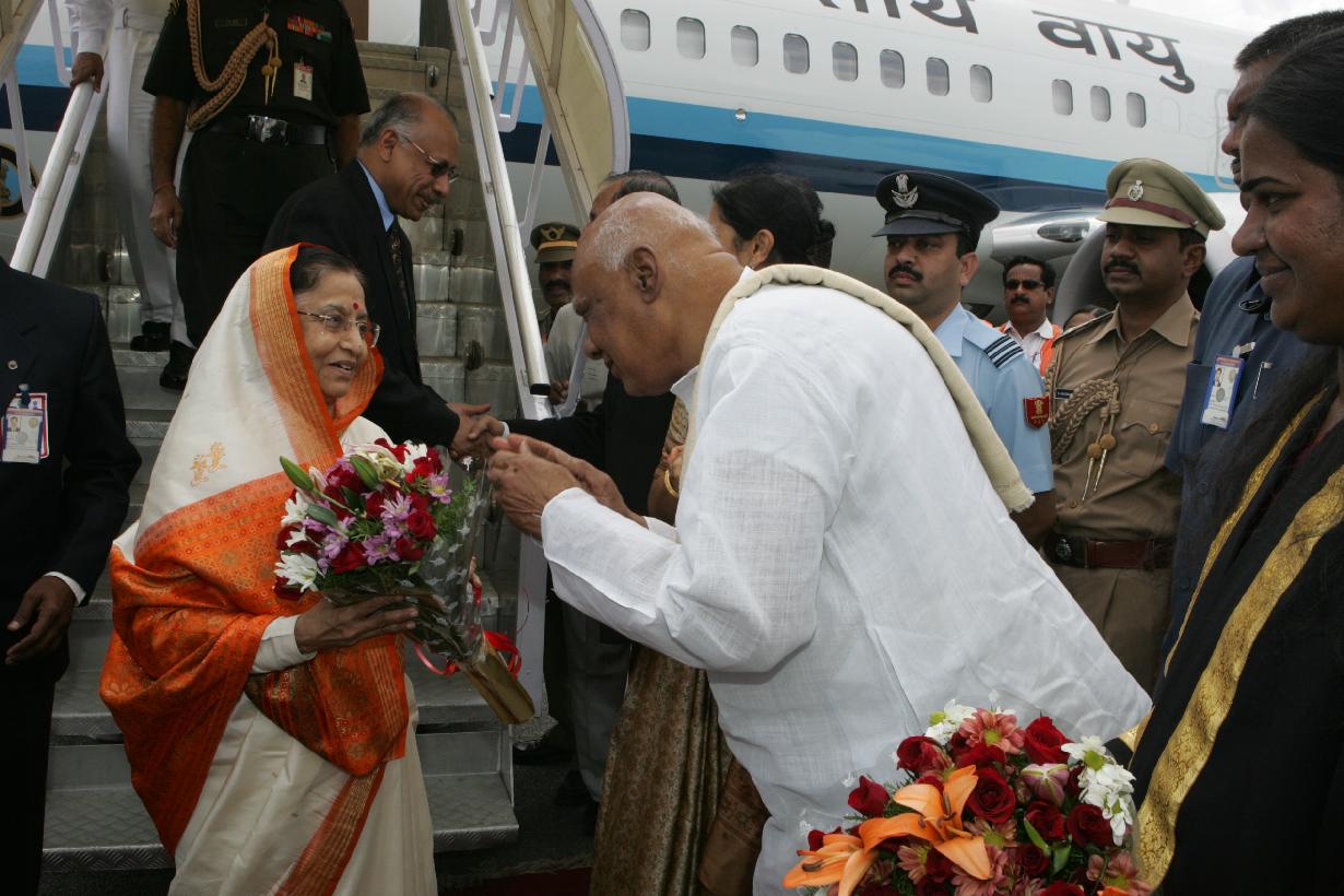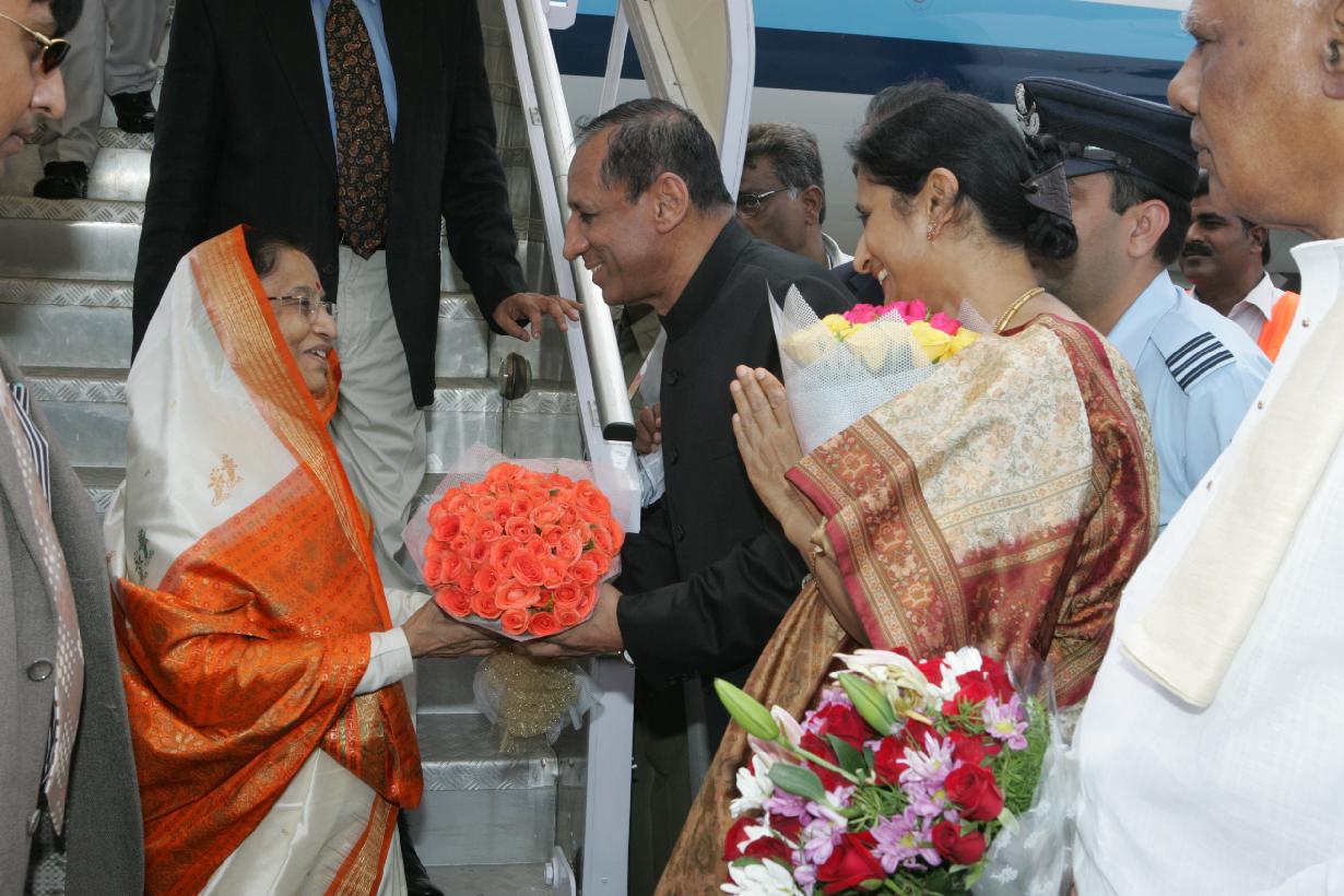 | Caption: | The President of India, Smt Pratibha Devisingh Patil being welcomed by Governor of Hyderabad, Shri E S L Narasimhan and Chief Minister, Shri Konijeti Rosaiah at Hyderabad Airport in Andhra Pradesh on July 04, 2010 |