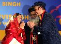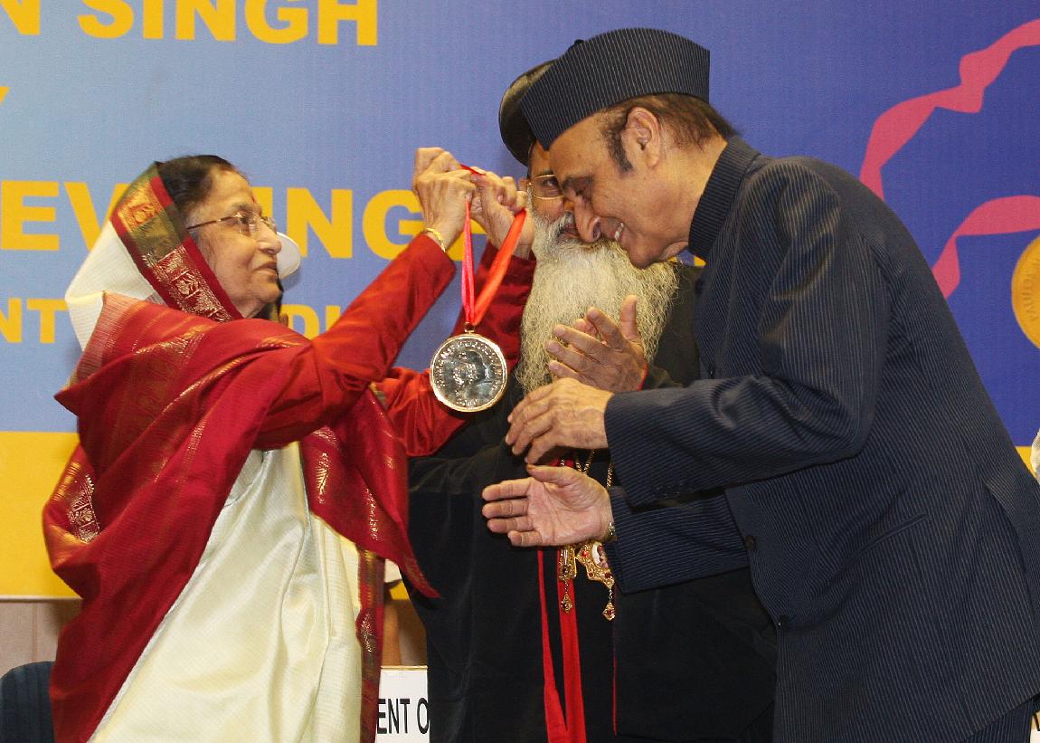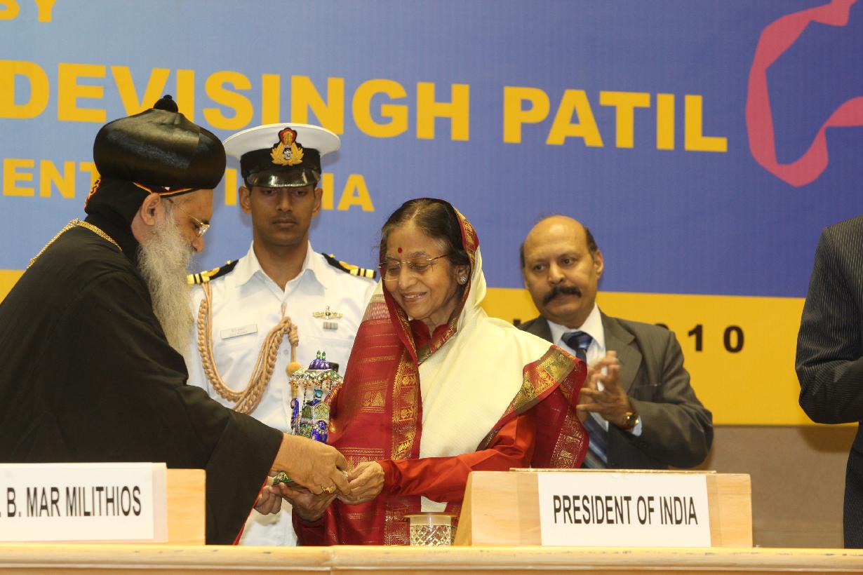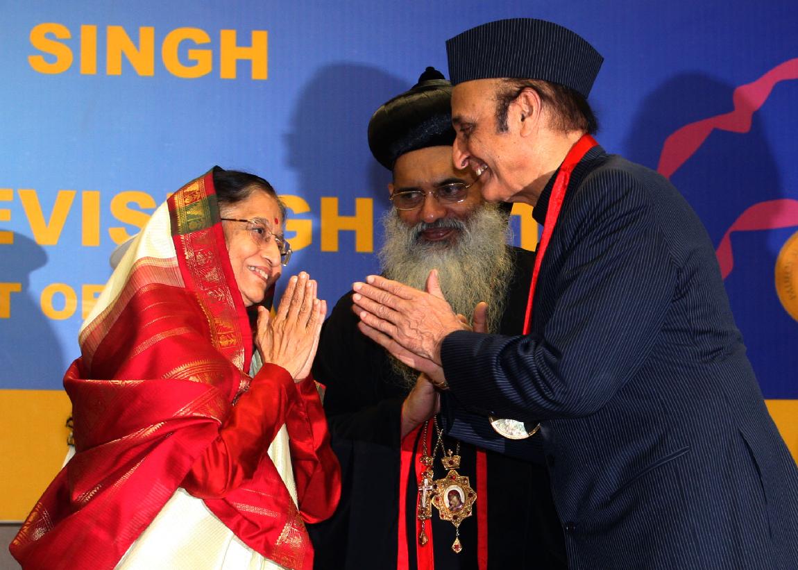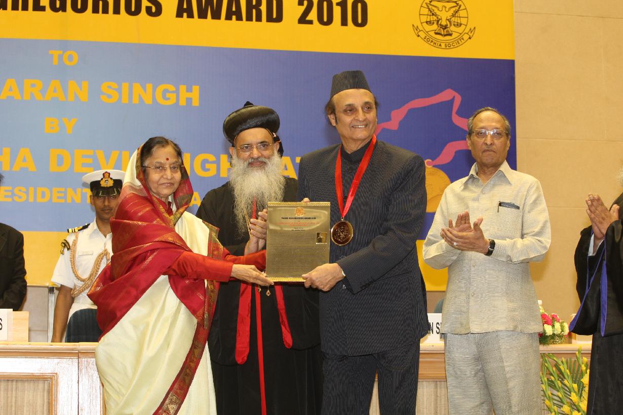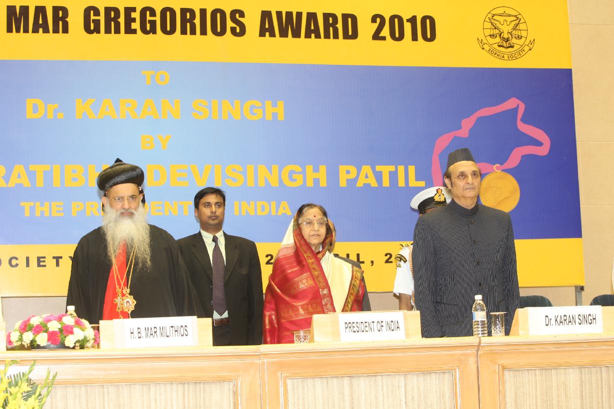 | Caption: | The President of India, Smt Pratibha Devisingh Patil presenting the 5th Dr Paulos Mar Gregorios Award to Dr Karan Singh in New Delhi on April 23, 2010 |