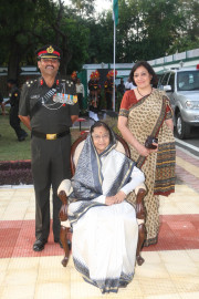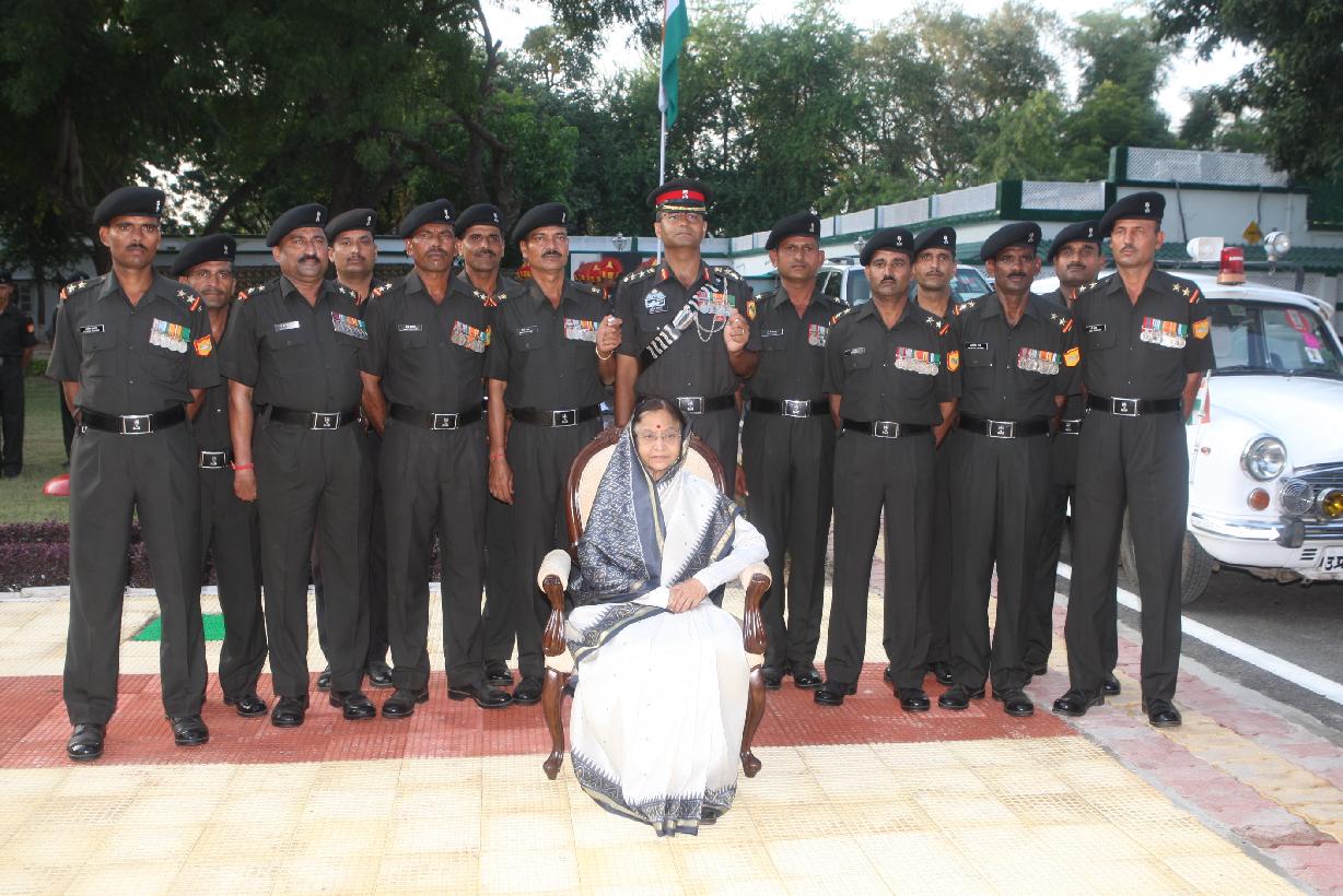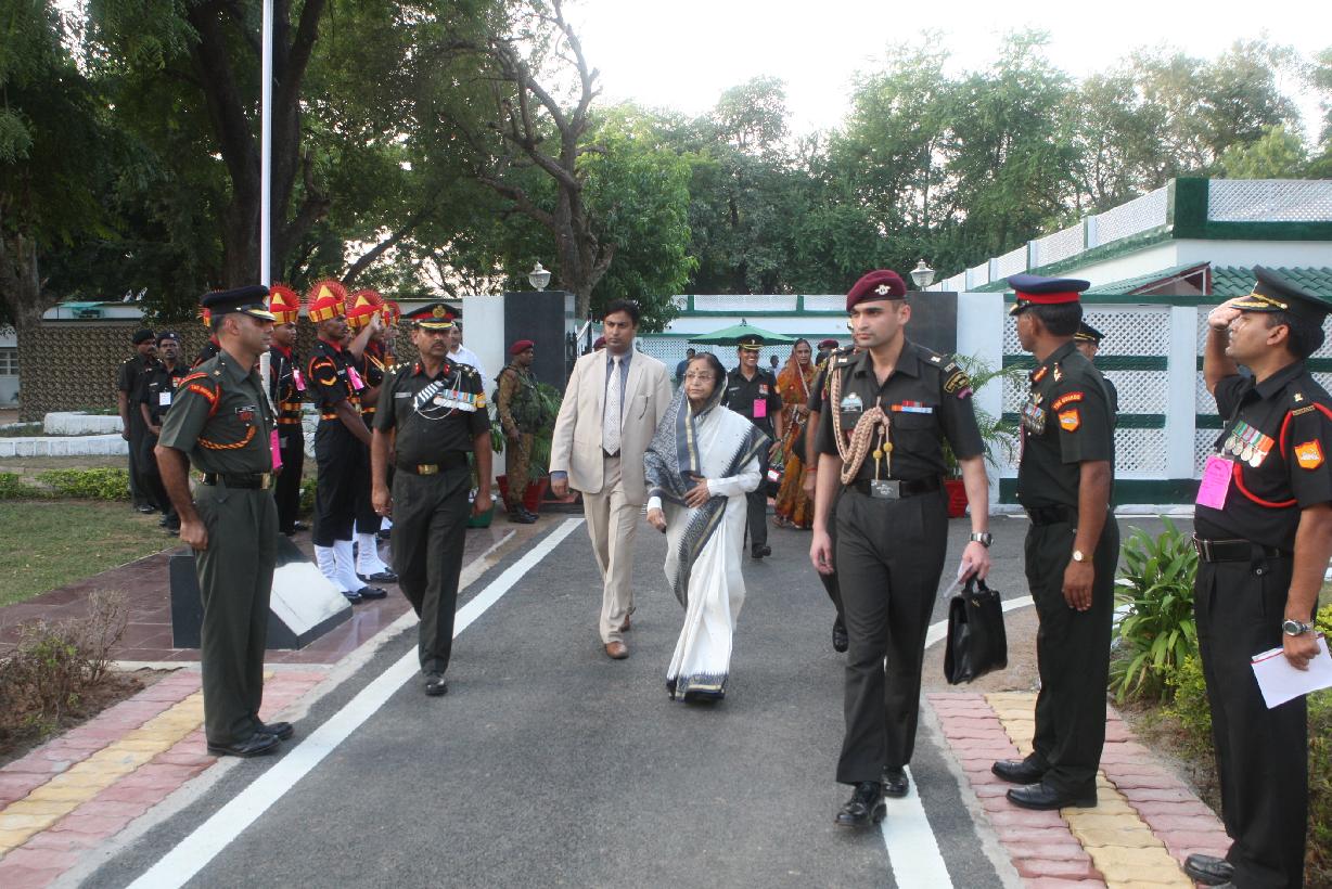 | Caption: | The President of India, Smt Pratibha Devisingh Patil posing for a Group Photographs with 27 Armored Brigade at Guest Room of Babina in Uttar Pradesh on Oct 19, 2010 |