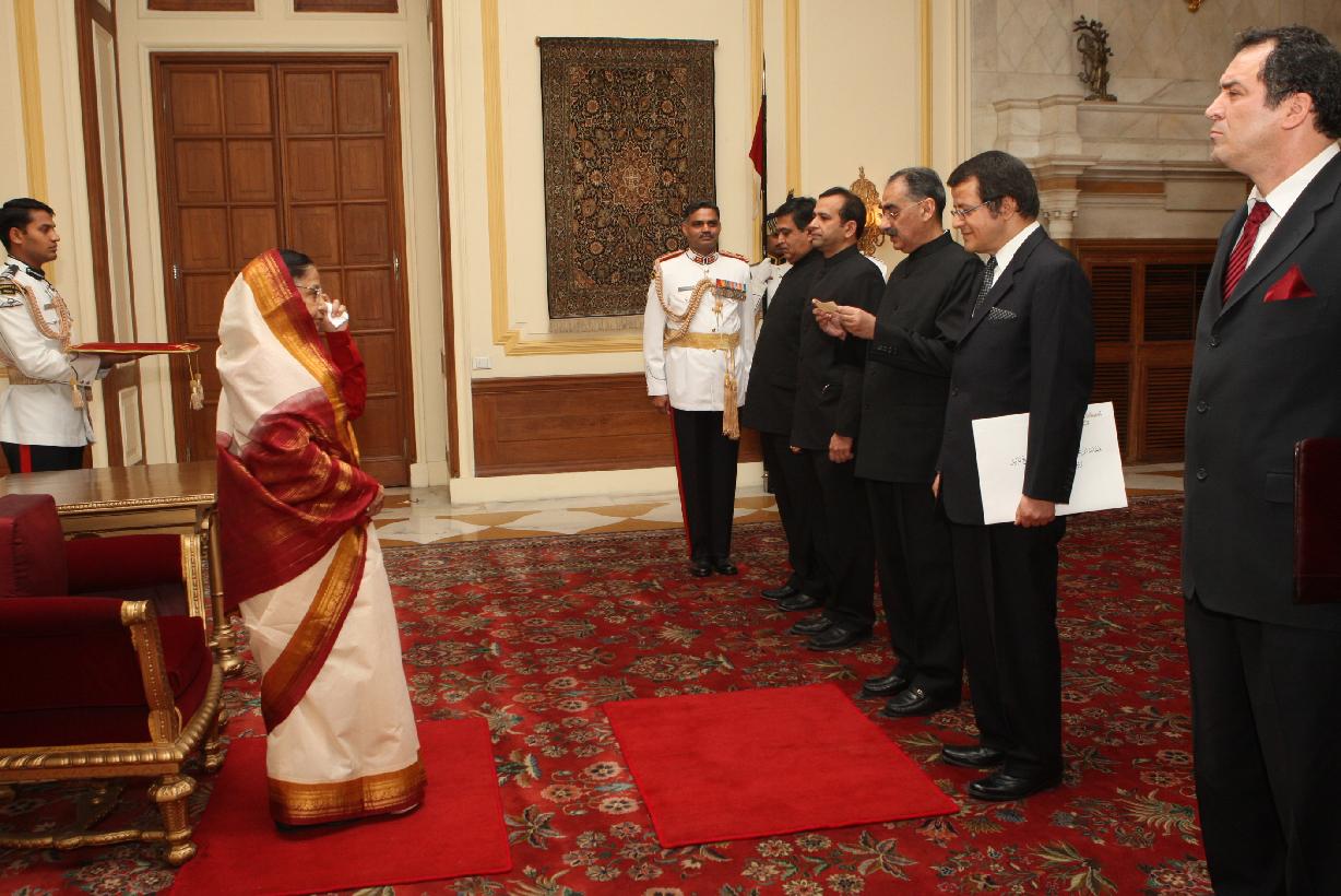 | Caption: | HE Mr Mohammed-Hacene Echarif, Ambassador-Designate of Algeria to India presenting his credentials to the President of India, Smt Pratibha Devisingh Patil at Rashtrapati Bhavan in New Delhi on April 08, 2010 |