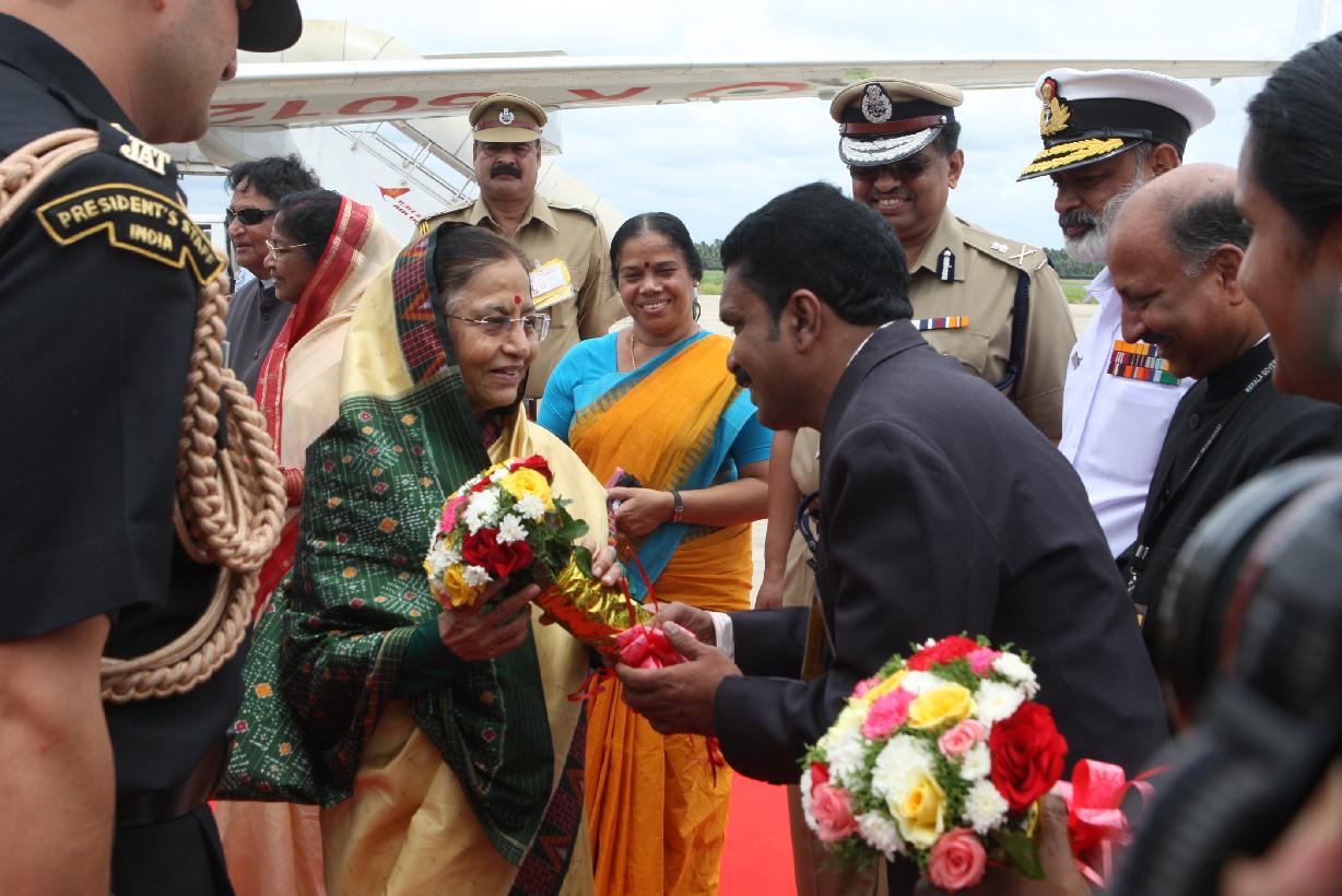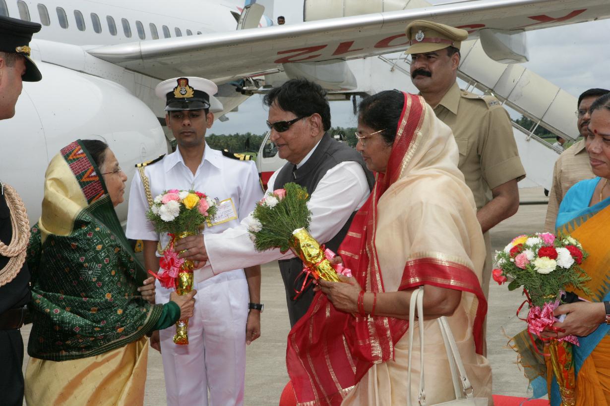 | Caption: | The President of India, Smt Pratibha Devisingh Patil being welcomed by the Governor of Kerala, Shri G S Gavai at Kochi Airport in Kerala on Aug 12, 2010 |