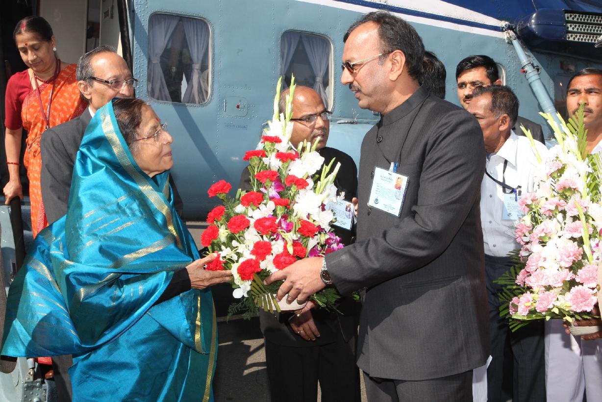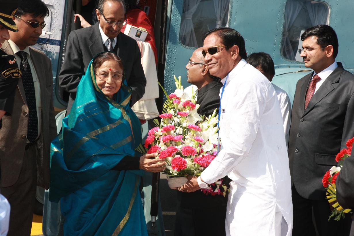 | Caption: | The President of India, Smt Pratibha Devisingh Patil being welcomed by the Development Commissioner of Daman and Diu , Shri P K Gupta at Diu Helipad in Daman & Diu on Dec 31, 2010 |