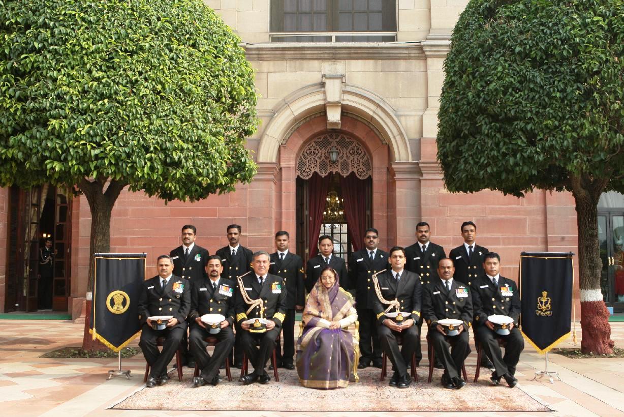 | Caption: | The President of India, Smt Pratibha Devisingh Patil posing for a Group Photograph with the Naval Officials at Rashtrapati Bhavan in New Delhi on Dec 04, 2010 |