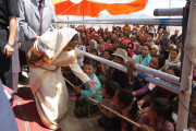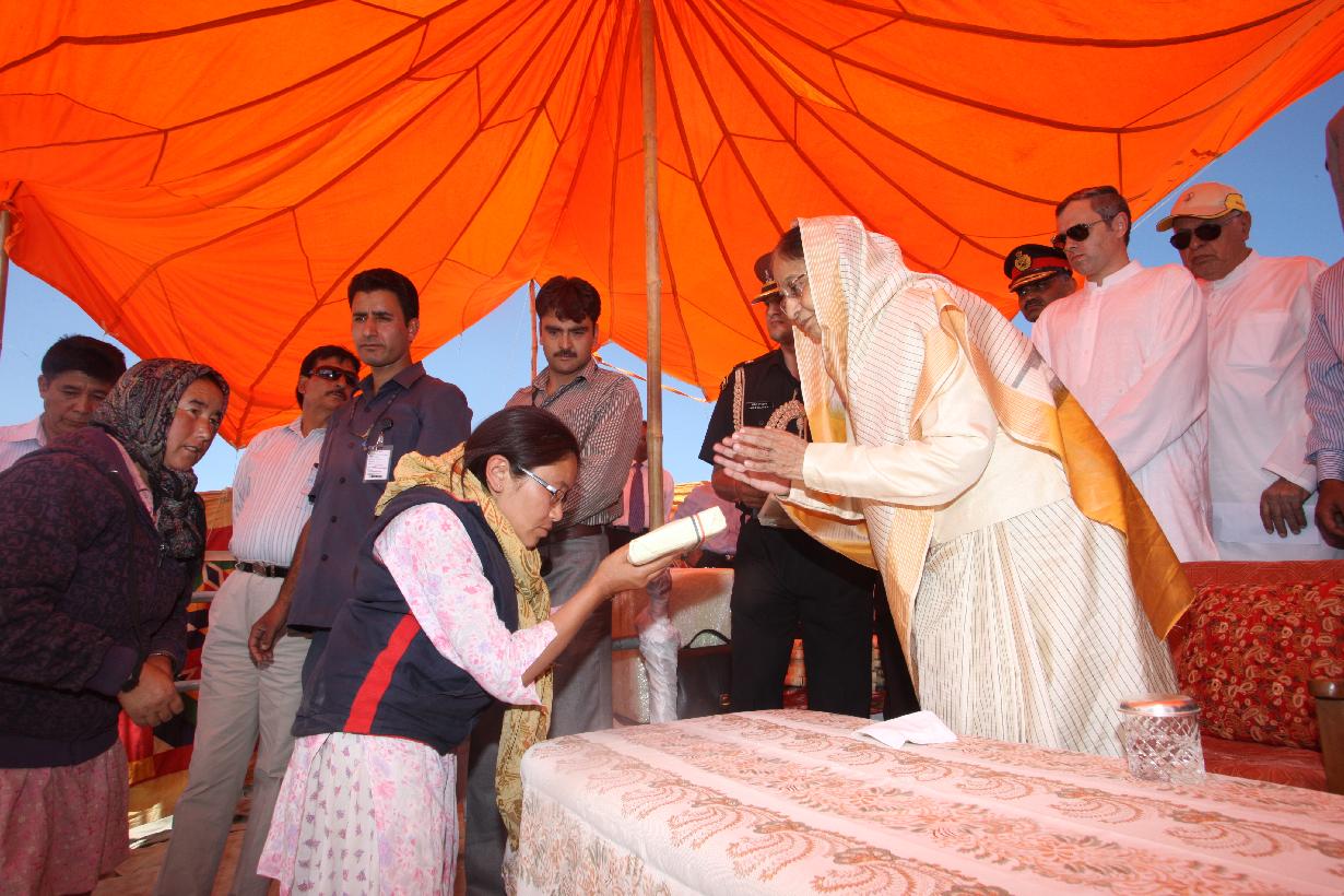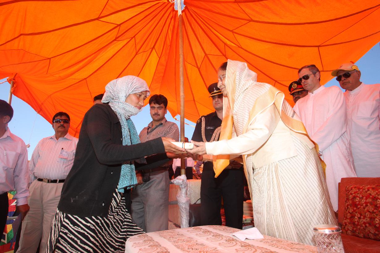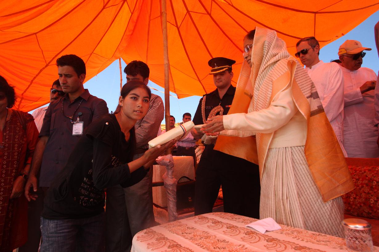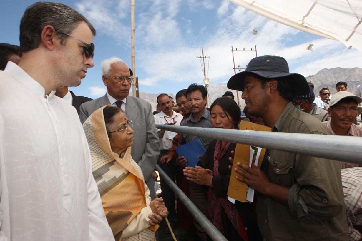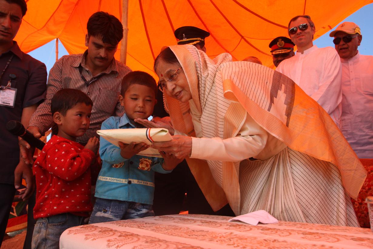 | Caption: | The President of India, Smt Pratibha Devisingh Patil interacting with Cloudburst Affected Families and giving them Woolen Garments at Leh in Jammu & Kashmir on Sep 01, 2010 |
