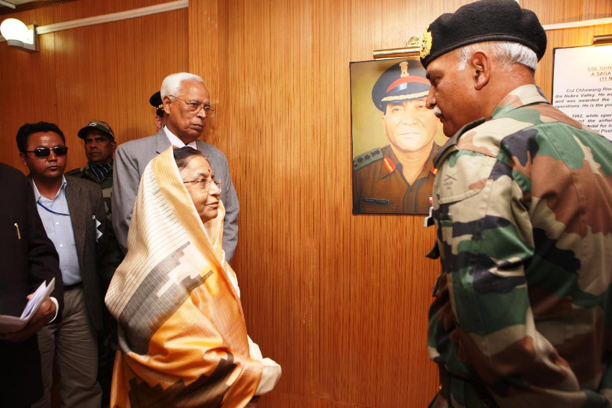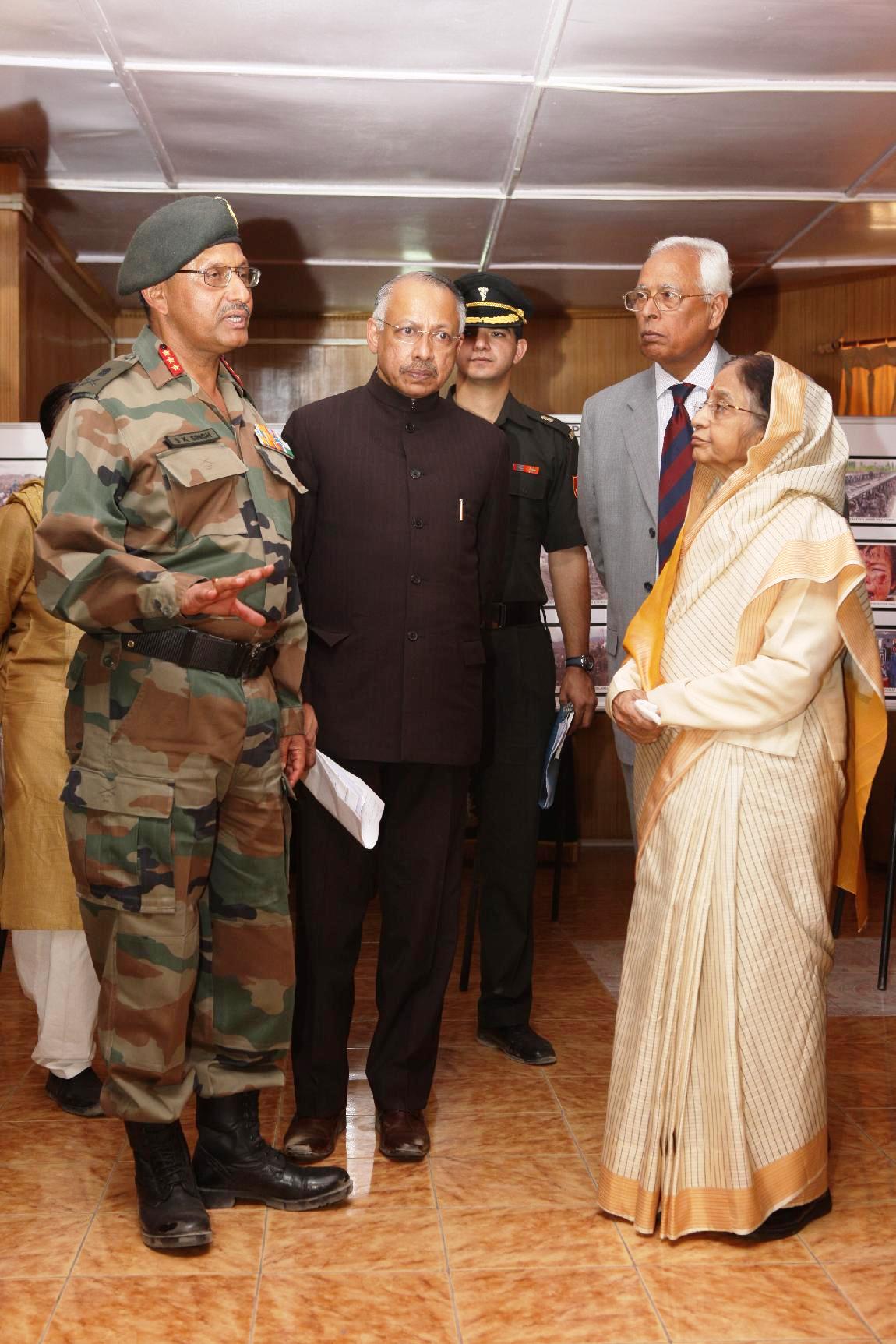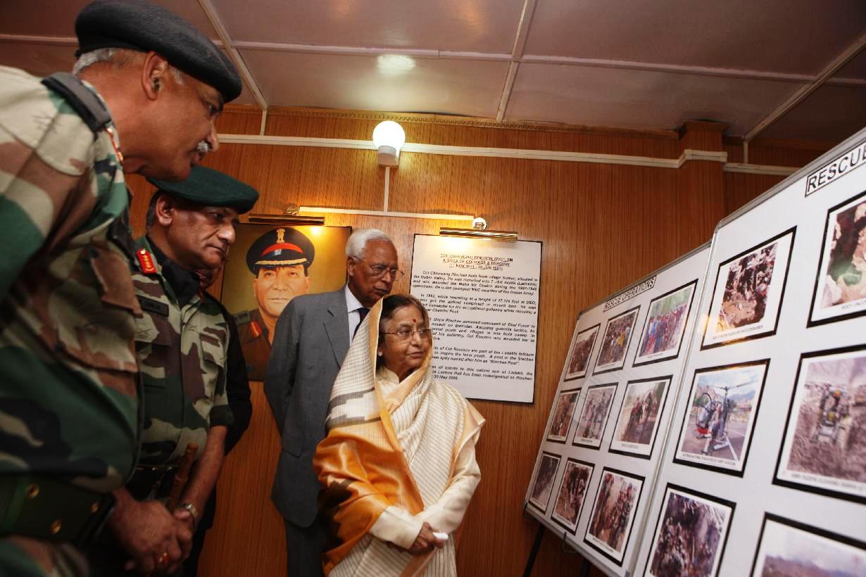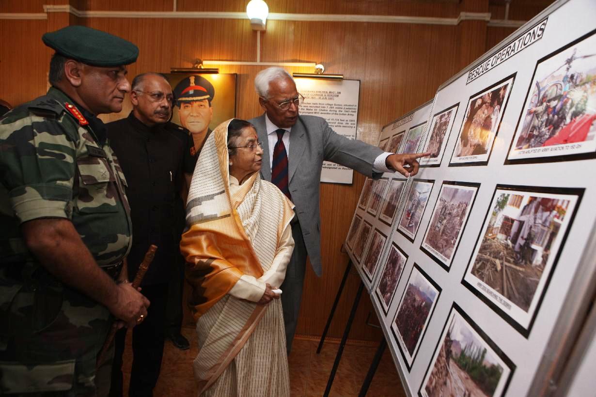 | Caption: | The President of India, Smt Pratibha Devisingh Patil seeing the Rescue Operation Photographs of the Areas Affected by the Cloudburst at Leh in Jammu & Kashmir on Sep 01, 2010 |