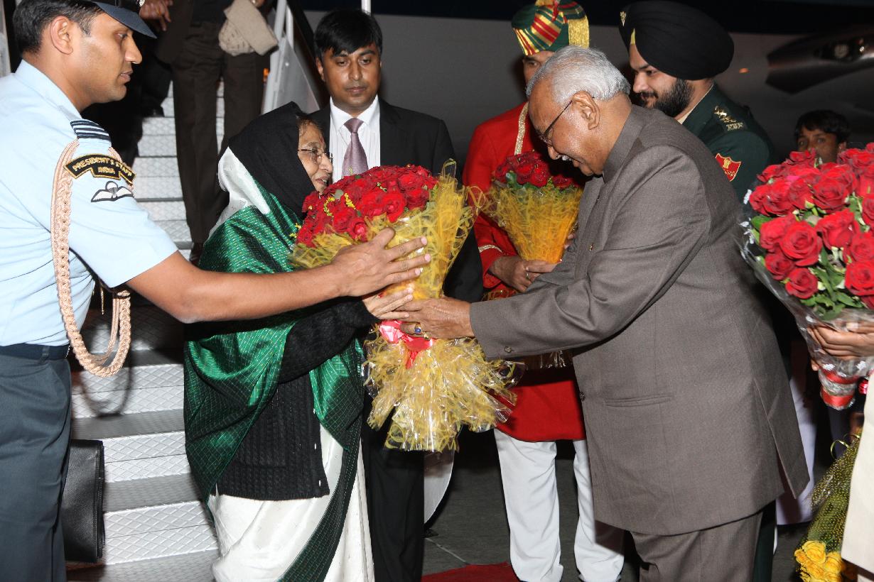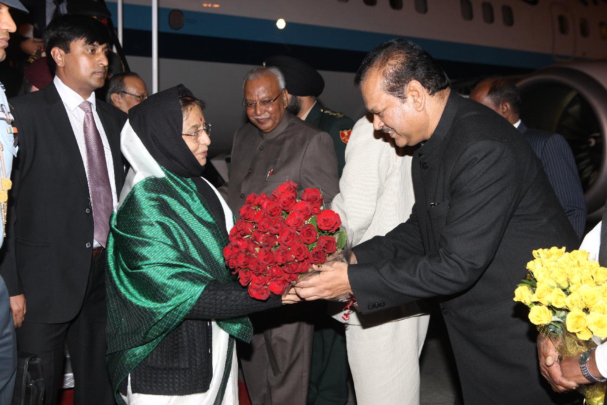 | Caption: | The President of India, Smt Pratibha Devisingh Patil being welcomed by the Governor of Jharkhand, Shri M O Hasan Farook at Birsa Munda Airport in Ranchi, Jharkhand on Dec 09, 2010 |