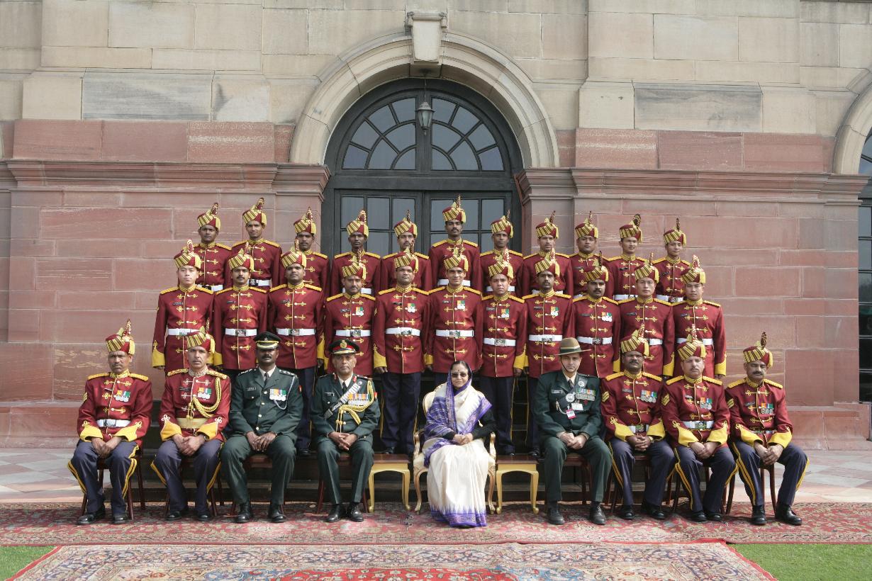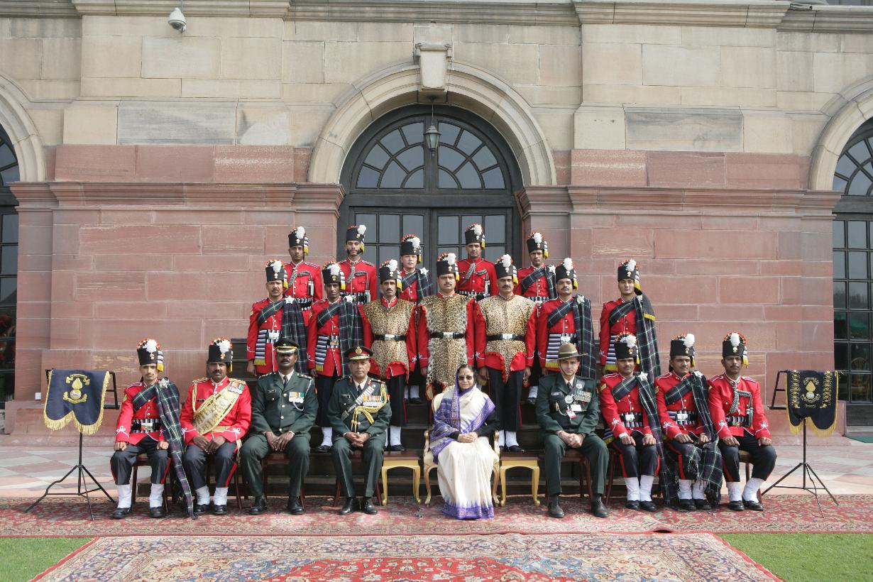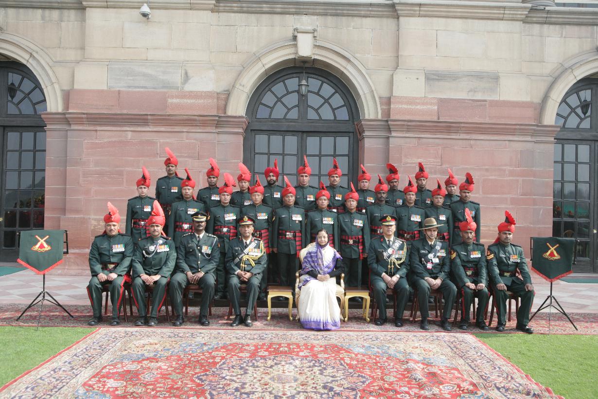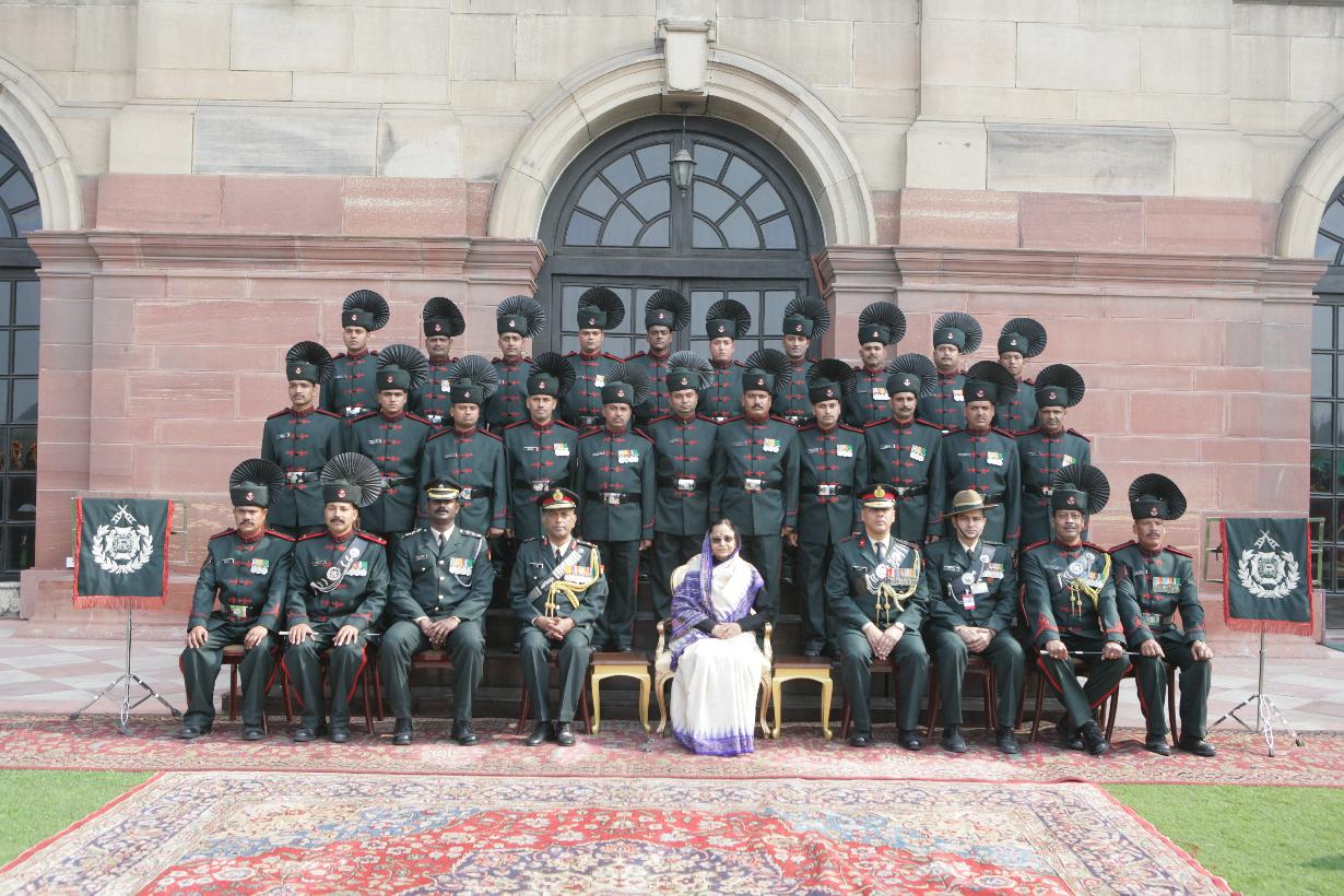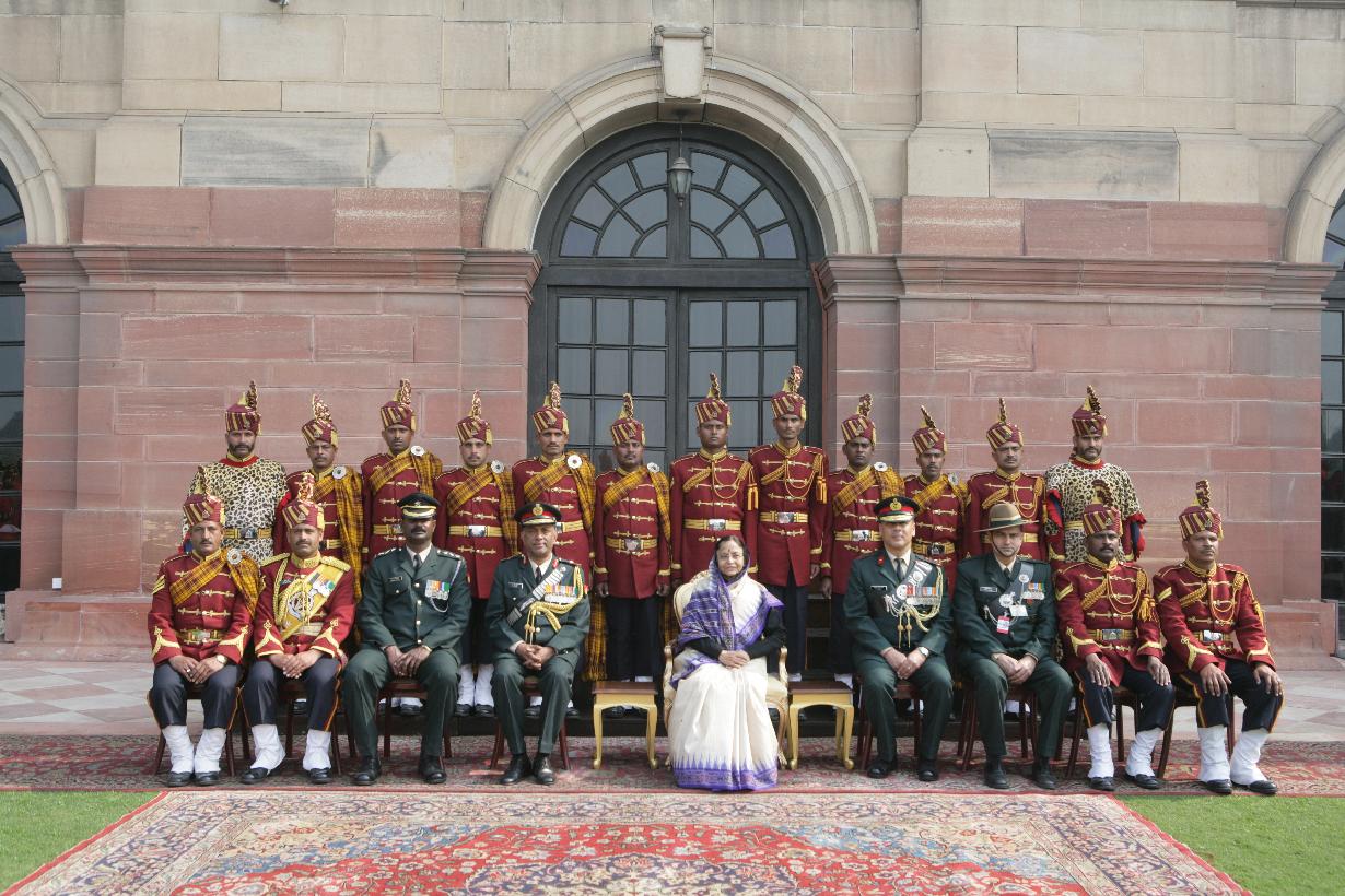 | Caption: | The President of India, Smt Pratibha Devisingh Patil posing for a Group Photographs with Tri Service Band Contingents at Rashtrapati Bhavan in New Delhi on Jan 30, 2010 |