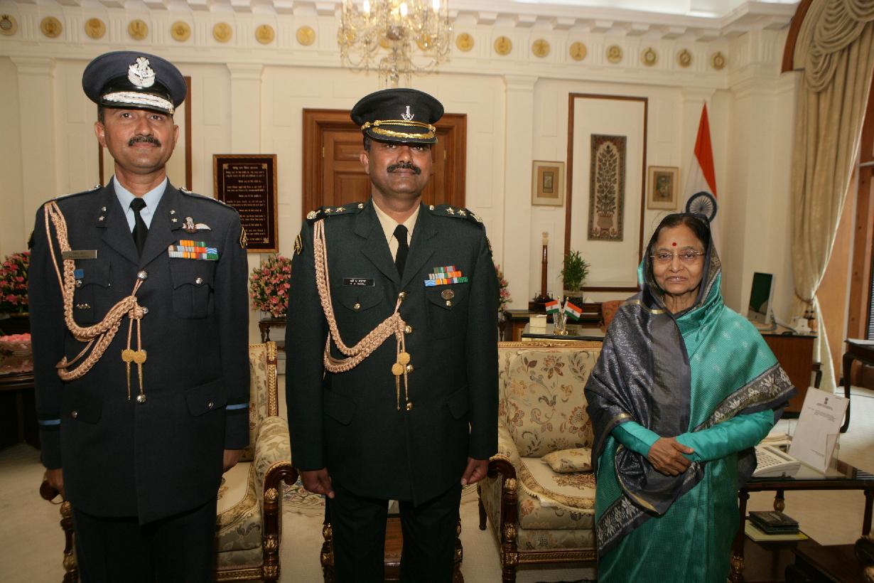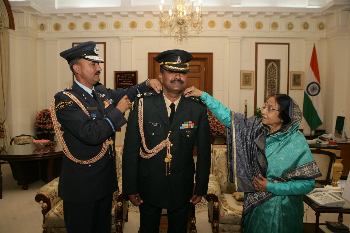 | Caption: | The President of India, Smt Pratibha Devisingh Patil pinning the Rank to JCO ADC V A Baral at Rashtrapati Bhavan in New Delhi on Jan 27, 2010 |
