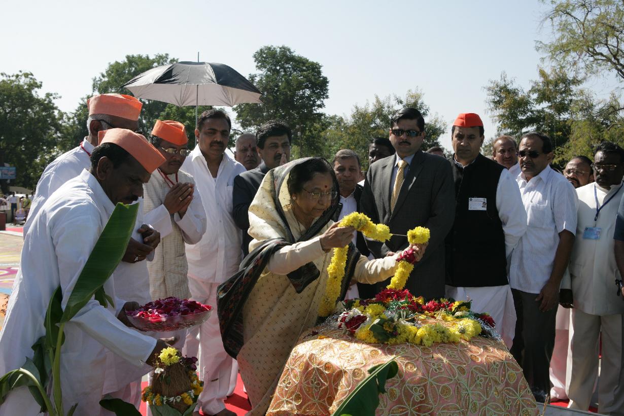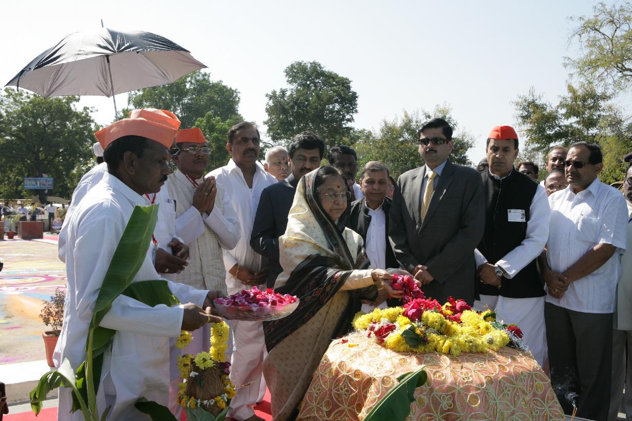 | Caption: | The President of India, Smt Pratibha Devisingh Patil paying homage at the Samadhi of Shri Tukdoji Maharaj at Mozari in Maharashtra on Jan 06, 2010 |